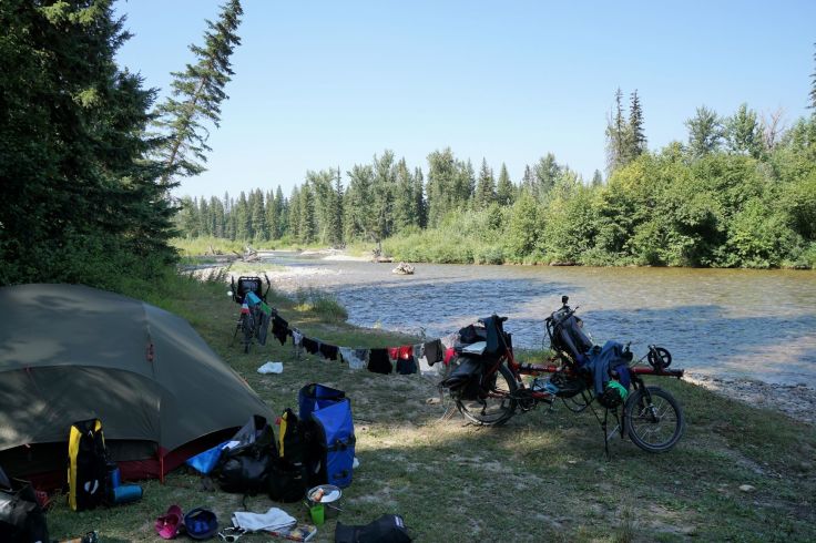 Les petites villes traversées sont l’occasion de se ravitailler, et nous trouvons généralement de quoi recharger les sacoches tous les 2 jours. Les nombreux lacs et les rivières sont autant là pour remplir les gourdes que pour laver les habits et la famille…