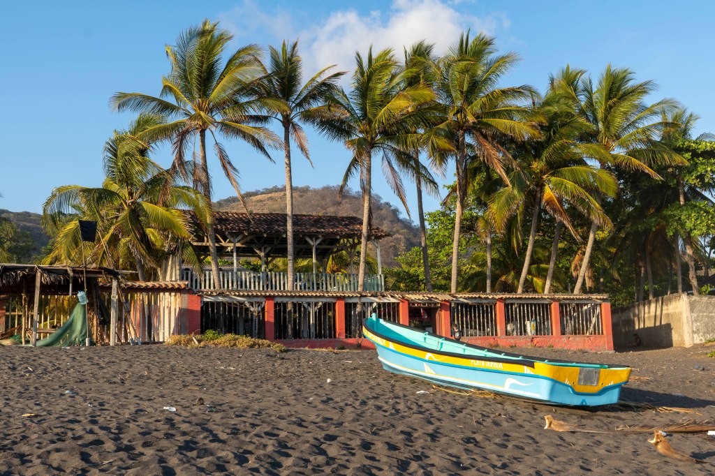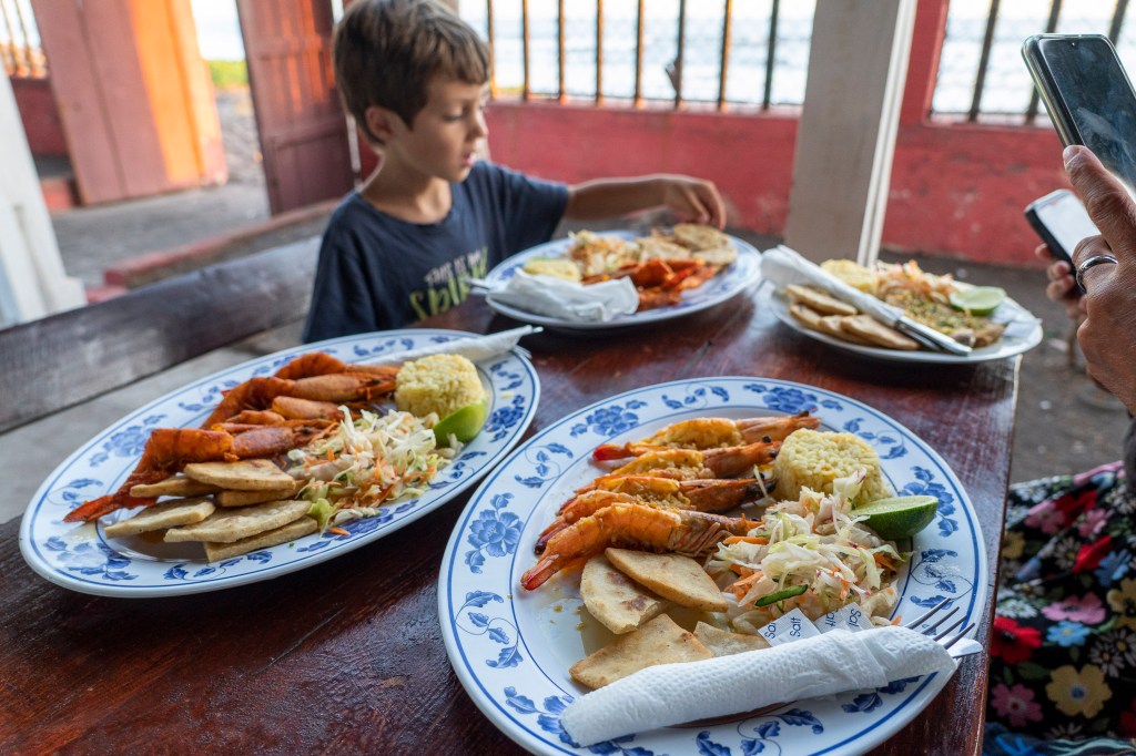 En échange de pouvoir poser notre tente ici gratuitement, nous mangeons dans leur restaurant: crevettes à l’ail ou panée (la spécialité de la côte salvadorienne est la crevette géante!!), filets de poisson frais à la coriandre! Notre premier repas haut de gamme du voyage. On apprécie d’autant plus que nous sommes seuls face à la mer et qu’ils sont vraiment d’une grande gentillesse envers nous…