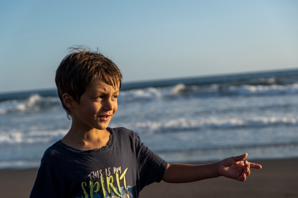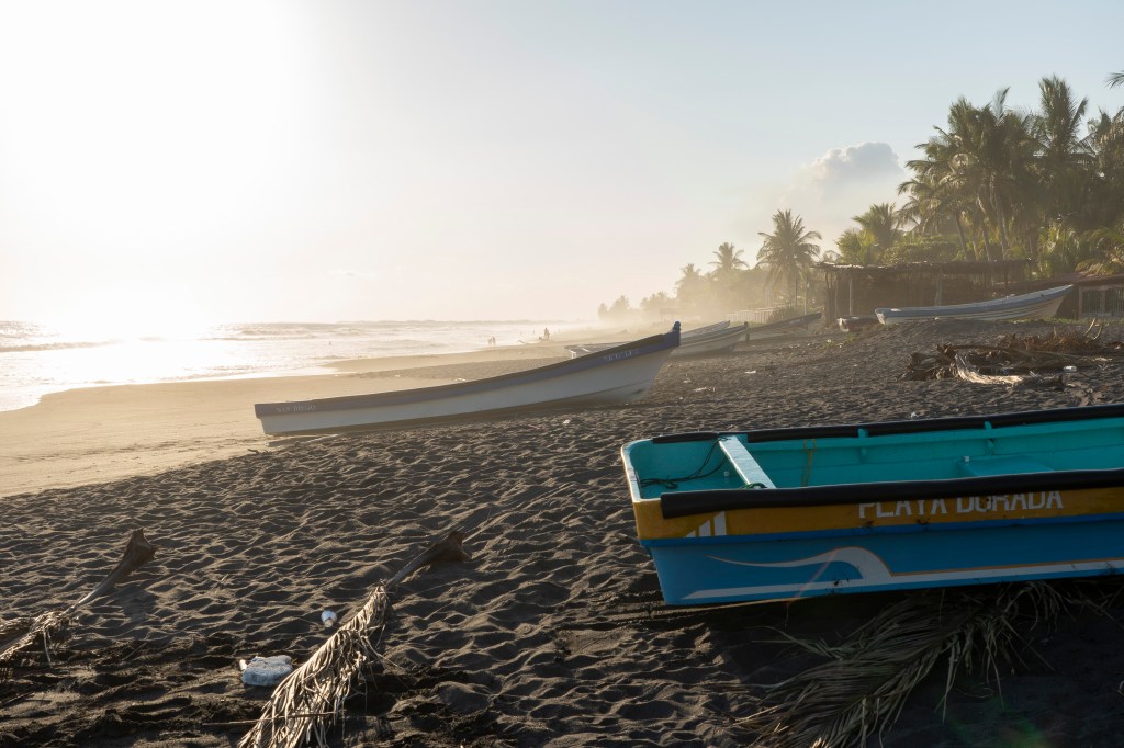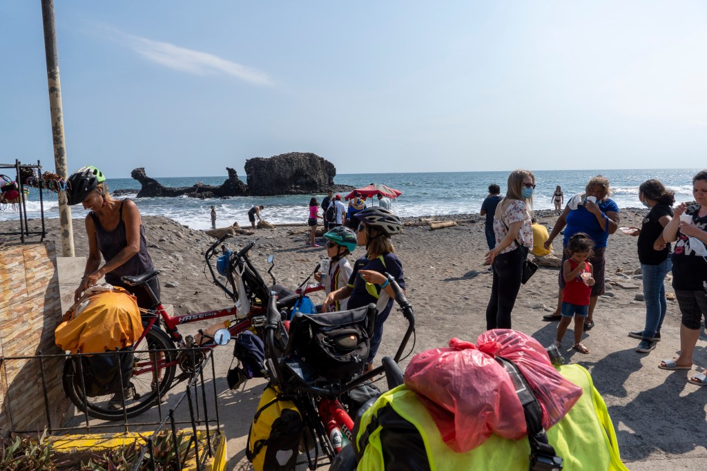 On tente notre chance au restaurant « Playa Dorada » qui accueille des locaux la journée uniquement, entre piscine et plage de sable noir (pays des volcans aussi!). C’est ok🤗…. Les enfants sautent déjà dans la piscine ! On en profite aussi de cette fraîcheur, t-shirt sur le maillot de bain. Ici comme au Guatemala, la baignade se fait habillée.