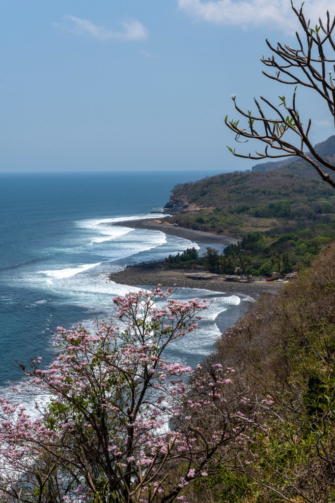 On ne vous dira pas que nous avons longé l’océan Pacifique sur 55km, avec vue sur les falaises (ancienne coulée de lave), les plages de sable noir, les palmiers, les arbres en fleurs, les vagues et ses surfeurs ! Non, non! Ça vous ferait trop de mal! 🤣