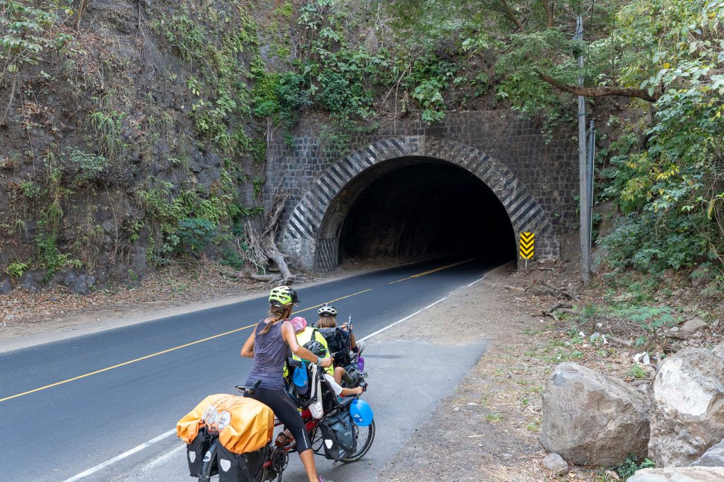 Que nous passerons 5 tunnels…. salvadoriens (et ça fait toute la différence !!!) : pas d’aération (Sylvain a pu apprécier la couche de pollution et de moiteur sur les murs), pas de sortie de secours, pas de shoulders (bande d’arrêt d’urgence), pas de lumière à l’intérieur, rien! Alors on ne dira pas que, lors du tunnel n°3, (seulement long de 577m) avec nos lampes frontales et solaires, nous étions plus visibles que la camionnette sans phares avec, à son bord, un copilote et son portable qui, de l’habitacle, essayait d’éclairer la route à son pilote!!!! 😳