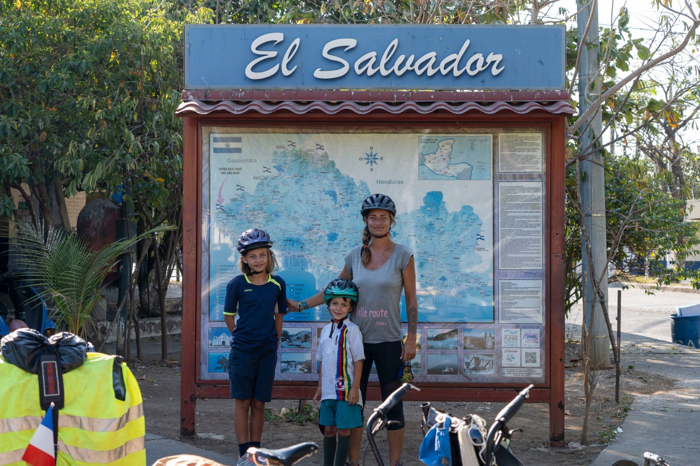 Le Rio Paz sert de frontière entre le Guatemala et le Salvador et nous y dépassons notre chauffeur rencontré la veille dans la file d’attente. Au moins, il a avancé !! De notre côté, il ne nous faudra qu’une heure pour faire vérifier nos passeports et tests PCR sur le pont, puis à l’immigration pendant que Sylvain doit ouvrir toutes les sacoches😩, puis à la douane pour compter nos sacoches sur les vélos ! Nous avons enfin notre sésame à garder pour la sortie du territoire. El Salvador nous voilà !!!