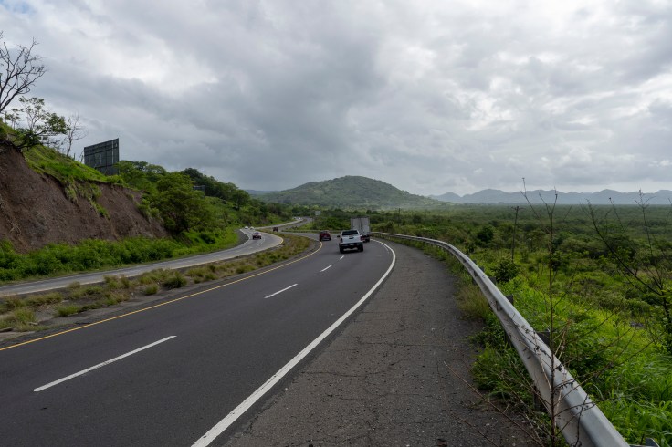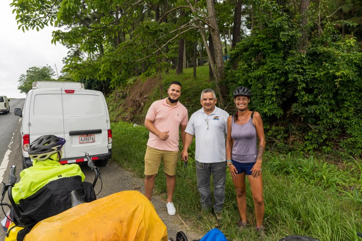On le quitte pour le bruit, le monde de notre Panaméricaine, les trous dans la route sur le shoulders, le vent de face, les montagnes sur notre gauche avec un petit rocher qui donne envie de le grimper… Nous ne sommes plus seuls! Les derniers coups de pédale s’amorcent ici. Les 2 derniers jours en Amérique Centrale. Quand on y pense, un peu de nostalgie arrive. 4 mois après ce second départ, ce second voyage. 4 mois plus tard, on termine cette portion inconnue. On y est! Heureusement, la vue est sublime tout autour de nous et cette chaîne de montagnes qui nous barre la route… qu’il va fallait non pas contourner, mais bien « gravir ». Alors les 20 km ont un goût léger. On avance bien, on profite de ces derniers paysages…