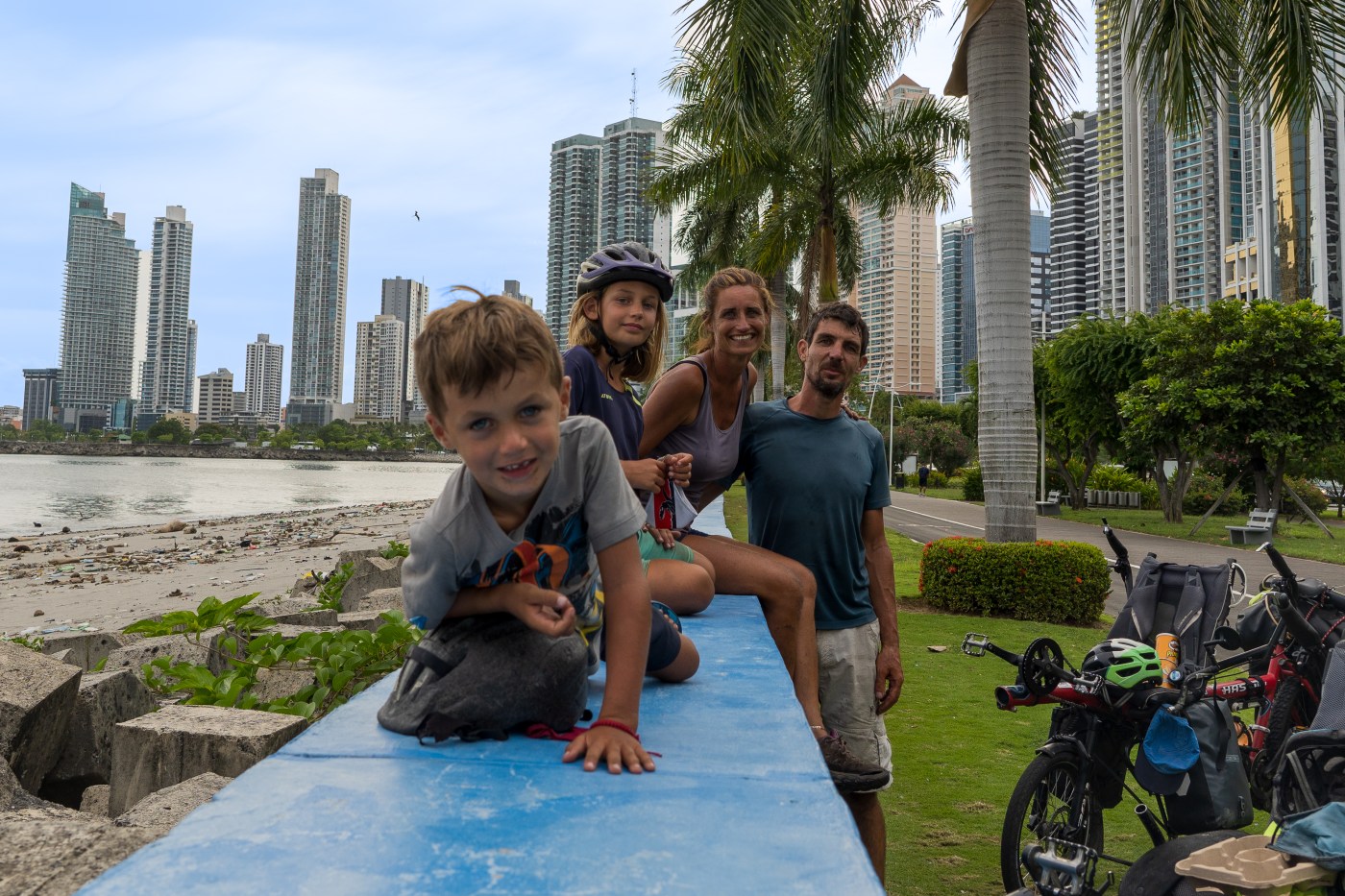10h départ tranquille du centre ville avec les buildings, direction un premier magasin de vélo qui est ouvert. Déception, la pièce du pédalier, si spécifique sur nos vélos, ils ne l’ont pas. Ni les disques de freins. Il y a d’autres magasins ouverts demain, on verra à ce moment là. On continue la découverte de la ville en passant sur les bords de l’océan Pacifique par la Cinta Costera. Piste cyclable, chemin piétonnier, jeux pour enfants, terrain de football: autant d’endroits où nous pouvons nous arrêter. Des photos s’imposent. Quasiment 3 km rien que pour les cyclos! Et aujourd’hui dimanche, la route Cinta Costera pour les voitures, 2 voies, est fermées et nous pouvons rouler dessus ! Extra! Arrêt à d’énormes jeux en cordage pour les enfants non loin des lettres colorées de la ville. Nous poursuivons jusqu’au Mirador de Pacifico. Le marché aux poissons est ensuite traversé pour aller au quartier Casco Viejo. Petites ruelles aux couleurs et style hispaniques, restaurants discrets, balcons travaillés, verdure aux fenêtres, fresques sur les murs…