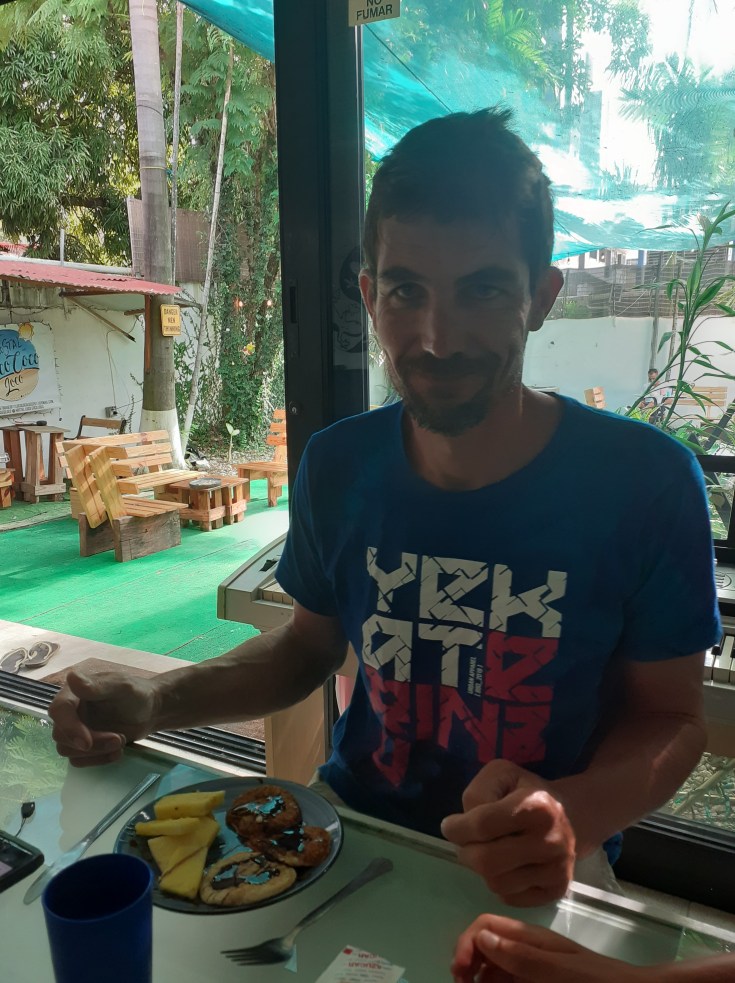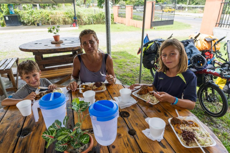 10km de plus et on se trouve un comedor avec dessins sur les murs Taz et Bob Razowski. Viande de bœuf mijotée ou poulet pour Emma, avec bananes plantins, riz, haricots rouges et excellente sauce avec des pommes de terre. Le repas est très copieux pour une fois, et il y a autant de viande que d’accompagnements!! On en garde même pour ce soir!