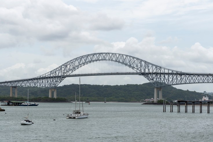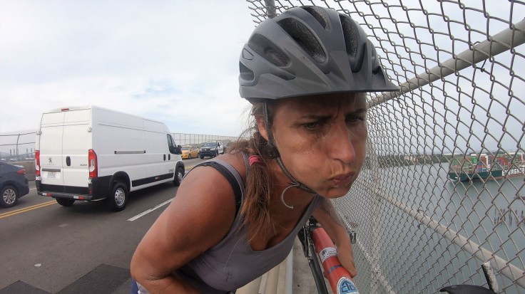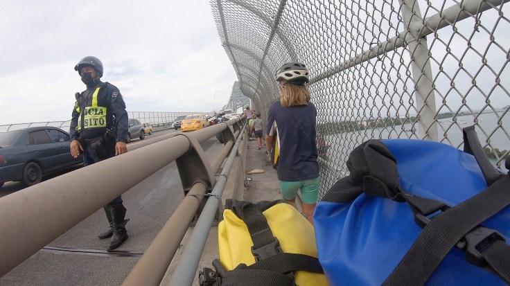 Et on arrive au pont des Amériques!!! Ce pont long de 1654 m, construit par les Etats-Unis, entre 1959 et 1962, surplombe le canal de Panama au niveau de l’approche Pacifique. Et donc, avant, un policier de l’autre côté nous interdit de le traverser à vélo. Il faut faire le tour par l’autre pont, plus au Nord. Le seul que l’on ait vu sur la carte passe au Nord de la ville par l’autoroute et cela nous rallongerait de 50km! Nooooon. On en a déjà fait 73. On ne peut pas faire ce détour. Il nous fait signe qu’en marchant, nous pourrions. On n’a pas fait plus attention que ça à ses signes et on aurait dû! On file donc au début de ce pont. Le chemin piéton est de l’autre côté des barrières de sécurité sans un espace pour le passage. Alors on lève les vélos un à un…. 50 ou 60kg… et Sylvain vérifie le passage piéton peu large avec une herbe. En effet, juste de quoi faire passer les vélos entre le muret en béton et le grillage donnant sur le canal du Panama. On force un peu…. mais on doit enlever les sacoches de devant. Ca passe pour ce début sur quelques mètres. Puis un lampadaire et sa boite de dérivation à son pied nous réduit encore plus le passage. Moins large du coup et ça ne passe plus. Alors on force. On enlève le retro. On force avec le grillage…. Un « combat » que l’on mène. Le temps passe…. Il est 16h. Et on n’avance pas. On roule sur les déchets. Les chaussures. Les plastiques. Les cagettes… jusqu’à un pare-chocs entier. Là on doit le faire passer au-dessus de nos vélos en montant sur le muret de sécurité car on est juste, juste déjà. Il n’y a pas un centimètre de chaque côté du vélo. Et encore un lampadaire…. 4 autres à vrai dire. Ou j’enlèverai une autre sacoche à l’arrière. Pour Sylvain, ce sera la tente en moins puis 2 autres sacoches. La merde quoi. Le vélo frotte de toute part, le guidon, les freins au niveau du guidon, la béquille dessous, la dernière sacoche à l’arrière. Je me coupe au niveau de la cuisse avec la barrière sur la gauche…. Enfin on voit la fin de ce passage mais on n’est pas encore à la moitié du pont. Et surprise: le chemin piéton se termine sur la route!!! On n’a pas le temps de réfléchir et paniquer qu’un policier en moto vient à notre niveau. On aurait dû prendre le passage piéton de l’autre côté qui est plus large et qui va jusqu’au bout! Putain! Quels cons! Bah, oui, les autres gestes! Il écarte alors les voitures de la file de droite près de notre barrière pour que nous puissions refaire passer les vélos par-dessus celle-ci et repartir. Donc branle-bas de combat: on enlève les sacoches posées sur le siège avant, on soulève mon vélo. On le met sur la chaussée de la 2×2 voies après le policier, on fait de même avec celui de Sylvain puis les enfants remontent dessus le temps que l’on accroche toutes les sacoches. Toujours une file en moins pour les automobilistes, le temps que nous fassions tout cela. Personne ne râle ni ne klaxonne… ouf! On n’est pas en France!!! Le policier nous suit même pour écarter les voitures venant de derrière, pour nous protéger!!! Alors là chapeau et merci. Il n’aura aucune réflexion désagréable envers nous! Rien. Merci. Il fait 3km ainsi, même après le pont pour notre sécurité. Nous nous arrêtons et le remercions. Quelle épopée! 🥴 (JE TIENS A SIGNALER QUE LE RIDICULE NE TUE PAS….🤣🤣🤣 )