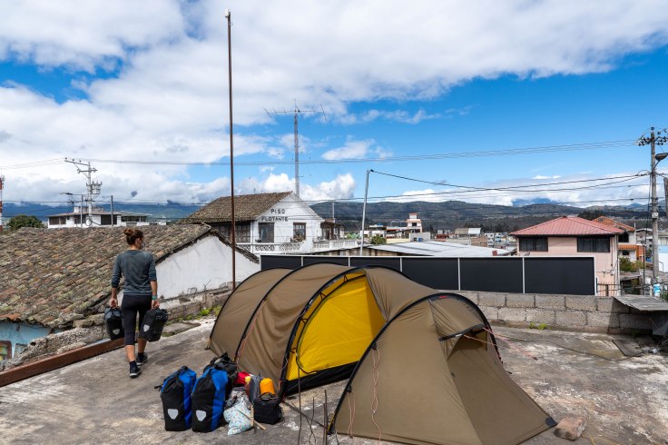 Son fils Anthony de 5 ans nous attend. Les enfants sont ravis! Montage de tente…. sur le toit de sa maison, pendant que nous admirons la vue sur les montagnes et les 2 volcans Chimborazo et Tungurahua.