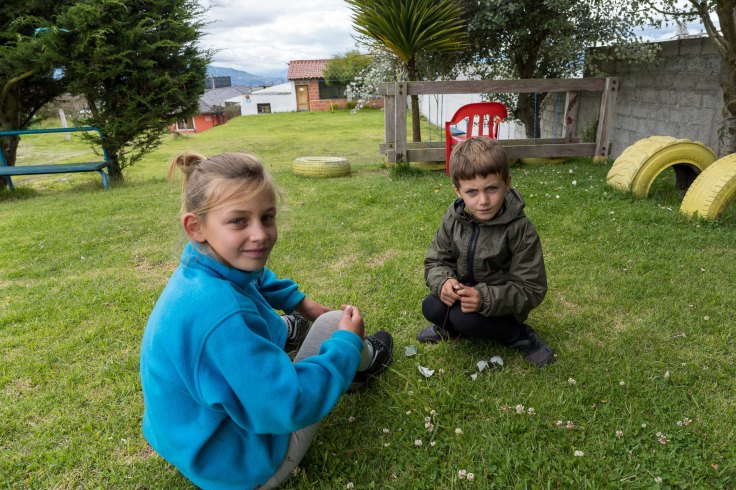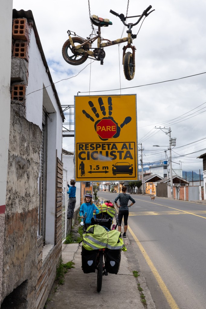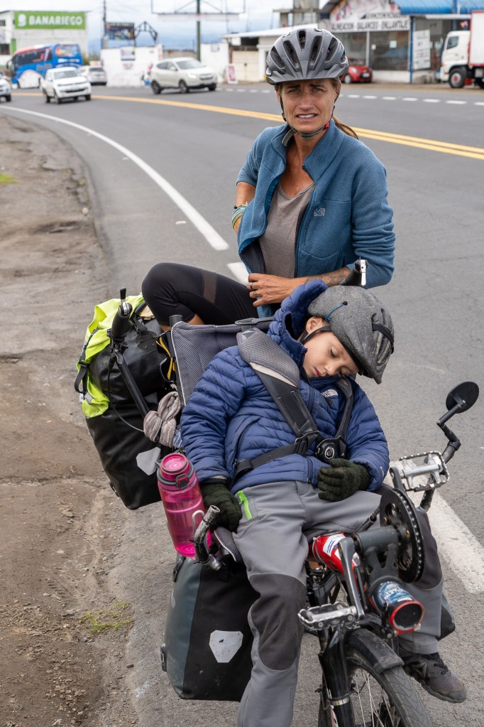 Le soleil, les nuages, le vent et la pluie jouent ensemble et c’est parfois difficile de s’accorder avec eux pour les habits. Raphaël émerge fatigué. Nous le prenons dans nos bras pour de gros câlins. Nous restons à son écoute pour savoir si nous continuons aujourd’hui en direction de Riobamba ou si nous restons chez Léo une nuit de plus (comme il nous l’a gentiment proposé!)… Raphaël veut continuer malgré sa fatigue du moment. Je dis moment car 1h après, il est parti du toit pour aller jouer avec sa sœur avec les vélos que Léo possède, et il en a! Une superbe collection. Nous voici rassurés et on plie donc les affaires!