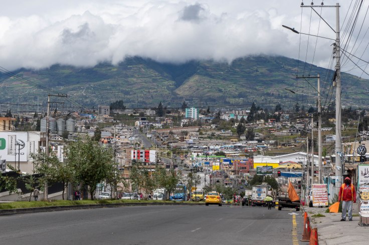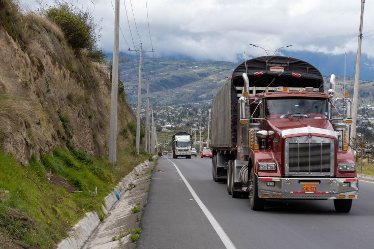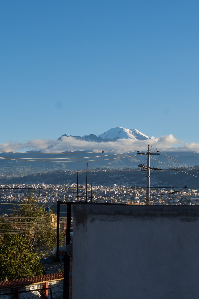 Et c’est la reprise de la route, dans la ville d’Ambato (où nous étions, au Nord) avec ses 165 000 habitants et ses nombreux feux. Cette fois, on préfère pour éviter tout le centre ville, prendre la Panaméricaine…. et on le regrette déjà avec cette belle côte que nous voyons de loin: on y passera sûrement 30min dedans… et on a bien visé! On connaît nos performances dans ce type de dénivelé maintenant!