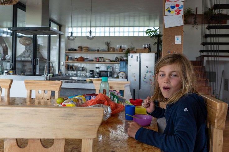 Très bonne soirée pour les enfants et les parents en discussion en anglais/espagnol ou français avec Eric. Repas convivial tous ensemble, avec du bon pain aux céréales avec un petit goût bien de chez nous. Raphaël mangera un peu puis au lit sur leur grand canapé déplaçable…