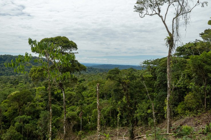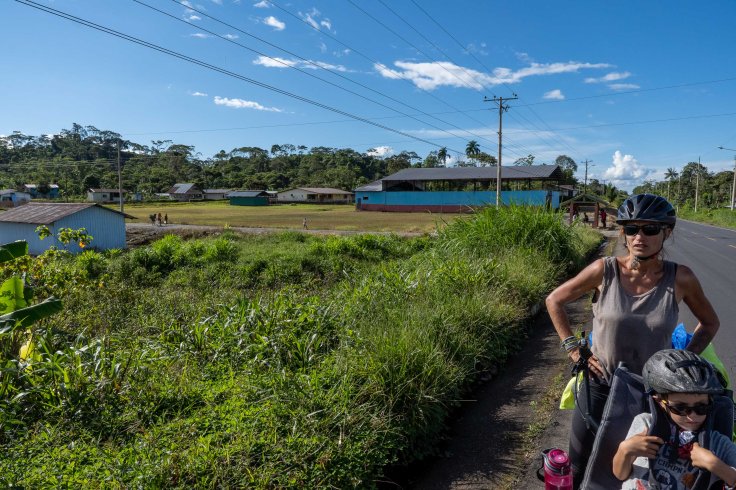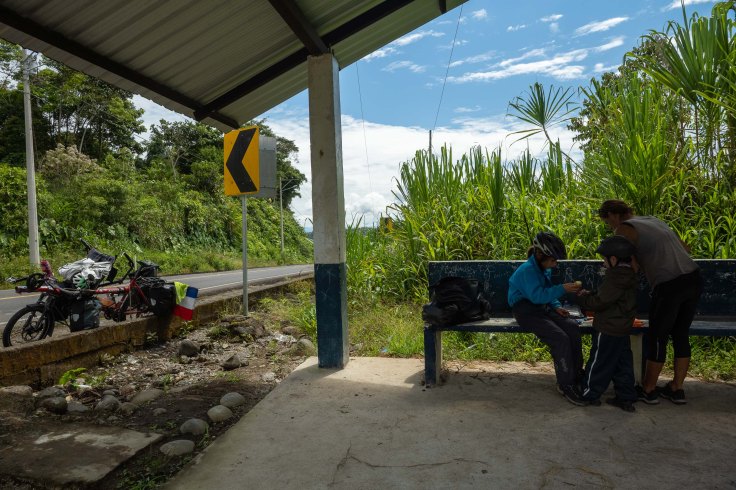 Ce matin, Sylvain nous a laissé dormir, ça nous fait du bien. Le temps est couvert avec de la pluie, heureusement la tente est sous un appentis au sec! Le petit-déjeuner se prend devant l’abside, avec un compagnon à 4 pattes qui nous fait des yeux doux. Raphaël va mieux et engloutit ce matin, ça fait plaisir! Quand nous partons de la station service, l’Amazonie est sous la brume, seules quelques collines pointent. La vue est tout de même superbe sur notre gauche. L’Amazonie est mystérieuse, silencieuse. Aucune route n’y va, aucune habitation n’y est visible. Que de la végétation jusqu’à l’horizon. La route est plutôt descendante, et nous ne traversons que quelques communautés. Elles nous font bon accueil, même sur la route.