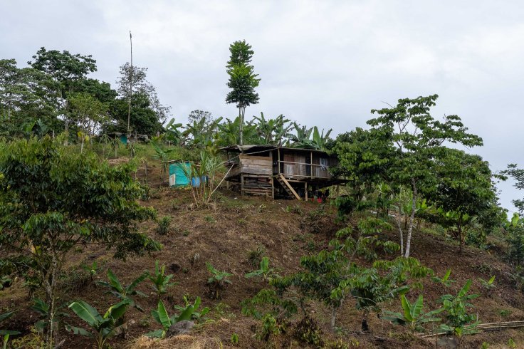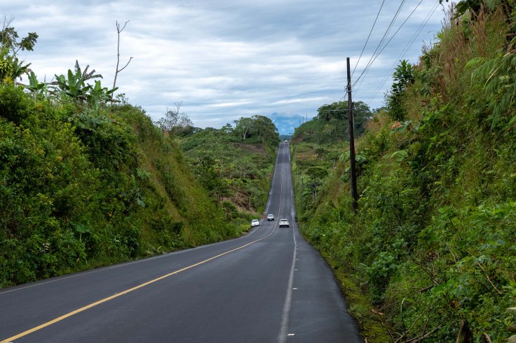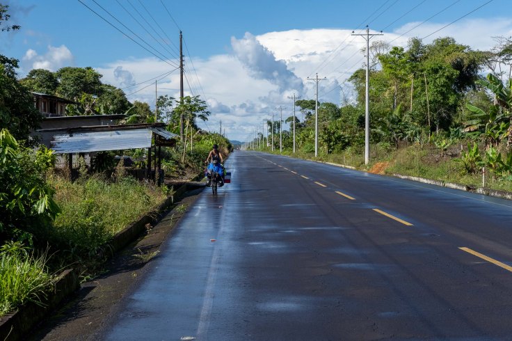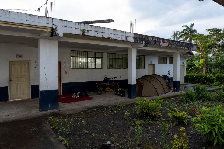 Le moral est au beau fixe, du coup. Les maisons sont en bois, légèrement surélevées par rapport au sol de terre rouge. Est-ce pour les animaux (notamment les serpents mortels par ici) ou la pluie et le sol boueux? Il y a beaucoup d’enfants aux abords des maisons. Peu de tiendas. Beaucoup de bois sont coupés devant les maisons. La végétation est omniprésente et fragile, le moindre m2 autour de la route et des maisons en est occupé. Les côtes et les descentes se suivent mais on garde un bon rythme. Serait-ce les bonbons à la menthe achetés récemment?? Ou le soleil qui revient? Et oui, il commence à faire chaud ici et très humide!!!.