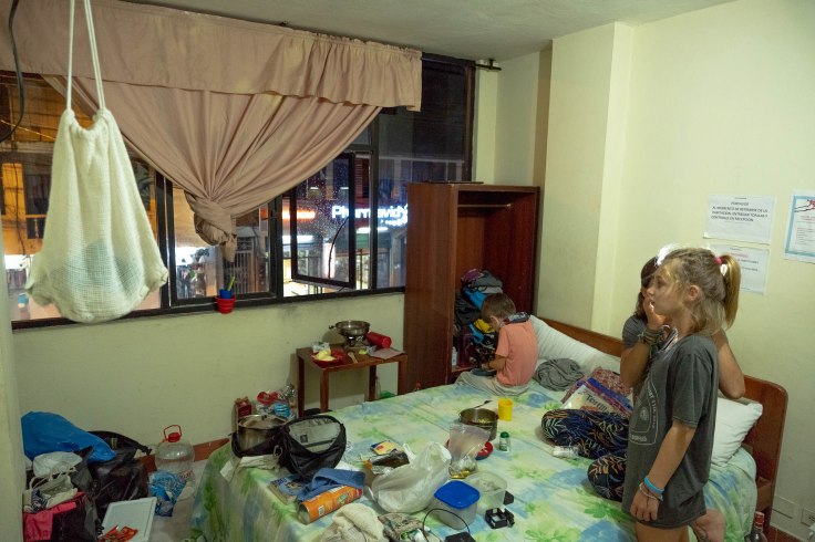 Dans un de ceux qui nous acceptent, nous profitons de sa situation au centre ville, pas loin des commerces pour se ravitailler. Dans notre chambre lit double et lits superposés (Emma adore dormir en haut!), nous faisons école avec les enfants (histoire de…) et nous nous aérons dans un parc pour enfants au sud de la ville! L’après-midi bien entamé, passe vite ainsi…. jusqu’à la tombée de la nuit où nous nous éteindrons avec les klaxons, musiques et lumières des trains touristiques!