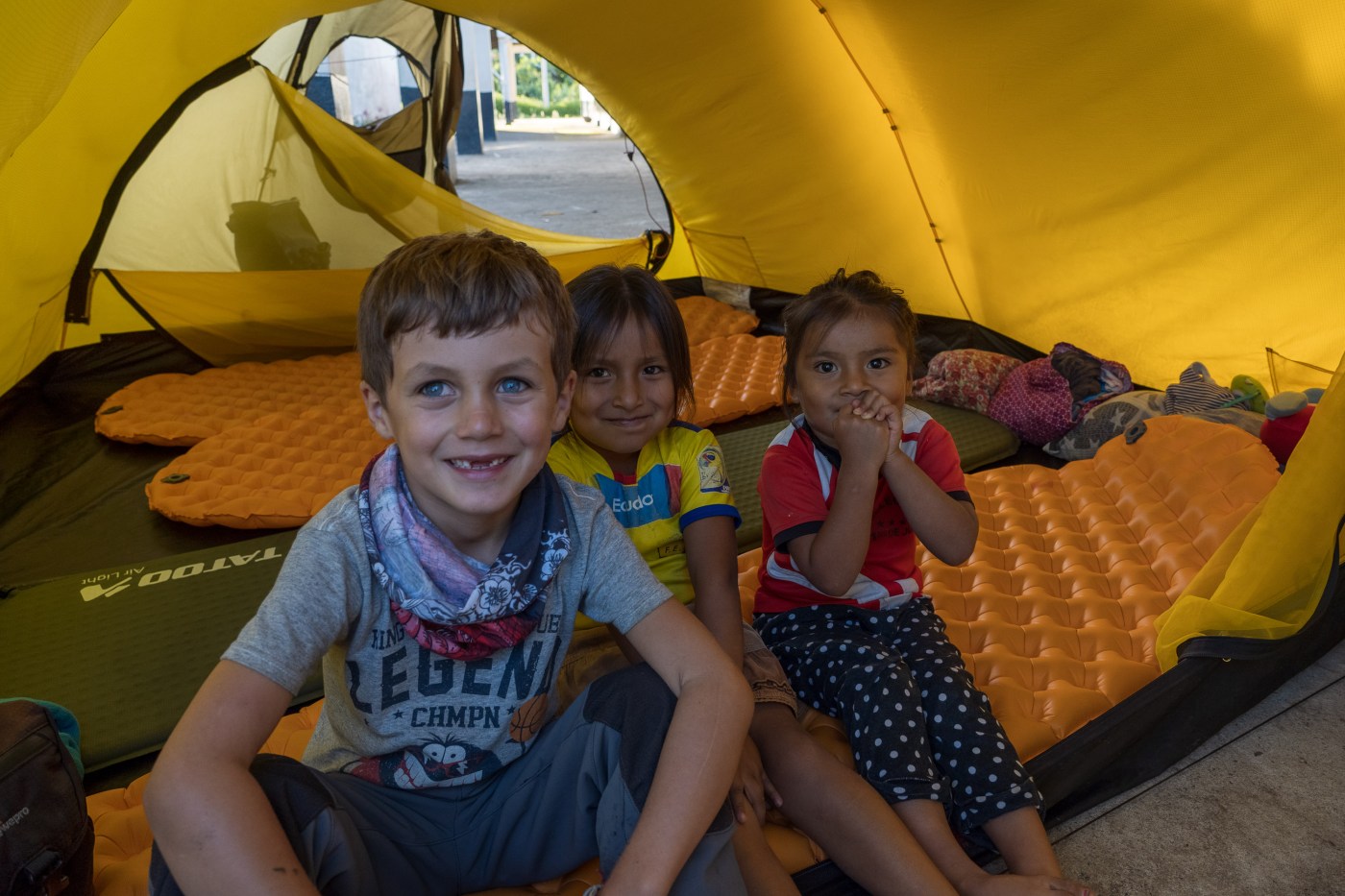 Leurs 4 enfants découvrirons pour la première fois une tente, les 2 plus petites filles passeront un temps fou dans la tente sur nos matelas, la plus grande plus réservée restera à regarder à l’écart tandis que Bryan le garçon, jouera dans la terre avec les enfants puis à courir autour des différents bâtiments de l’école fermée. Ils s’amusent et cela fait plaisir à voir.