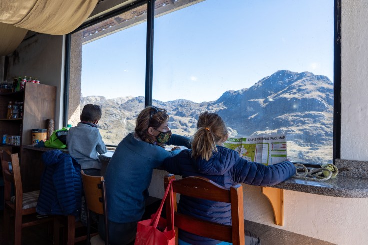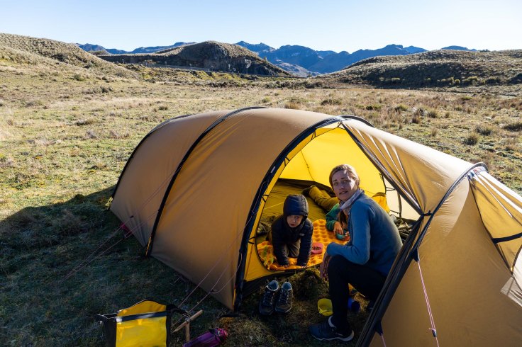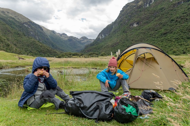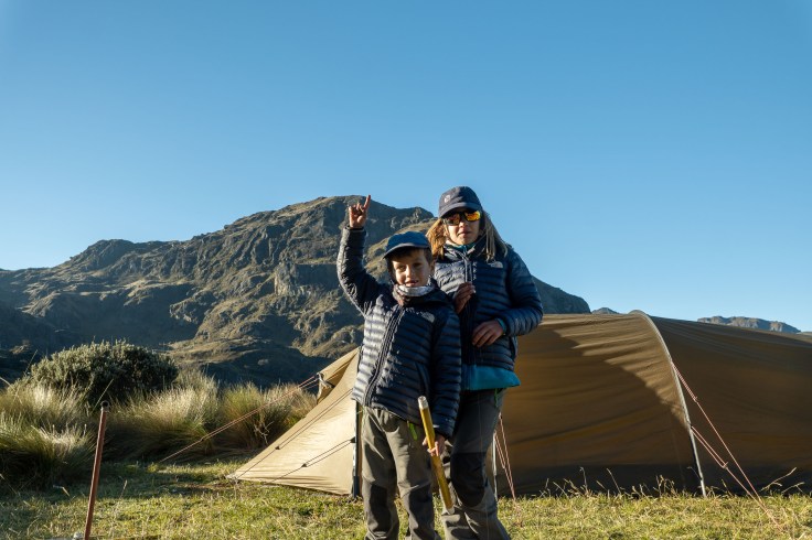 Toute la famille s’affaire ensuite Ă prendre le maximum d’affaires pour notre campement, situĂ© juste aprĂšs une tourbiĂšre que nos baskets n’apprĂ©cieront pas! On monte la tente sous le vent, laissons les enfants jouer autour et repartons avec Sylvain rĂ©cupĂ©rer les derniĂšres sacoches et gobilles accrochĂ©es sur les tandems. Le gardien nous autorise Ă les placer dans le centre d’accueil jusqu’Ă demain 7h30 plutĂŽt qu’ils dorment sur le parking, ouvert Ă tous! 10 litres d’eau rĂ©cupĂ©rĂ©s en prime, nous marchons vers notre « chez nous » du soir. Imaginez: la tente sur un Ă©peron rocheux face Ă la lagune et au sommet de ce midi le San Luis! Encore merveilleux!