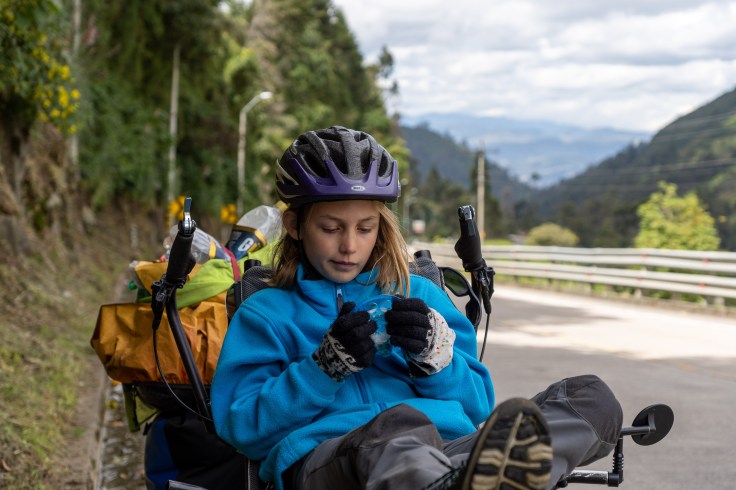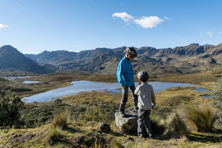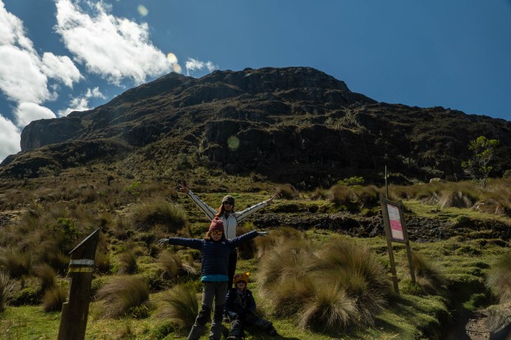 L’accĂšs au parc est gratuit. Par contre, nous ne pouvons accĂ©der Ă la lagune Llaviucu avec les vĂ©los mĂȘme si nous devons y camper. On ne peut mĂȘme pas emmener toutes nos affaires avec les vĂ©los et les ramener Ă l’entrĂ©e pour la nuit. Et le parc ne se fait qu’Ă pied: dĂ©sillusion pour la traversĂ©e des Cajas. Alors on laisse les vĂ©los et on emmĂšne toutes les sacoches que nous pouvons avec nous pour le dernier kilomĂštre avant notre campement. On monte la tente sous le vent, les enfants commencent le dĂ©jeuner Ă 13h30, pendant que Sylvain retourne chercher les derniĂšres affaires. Nous finissons de manger ensemble en musique, avec un superbe paysage tout autour de nous. La rĂ©compense.