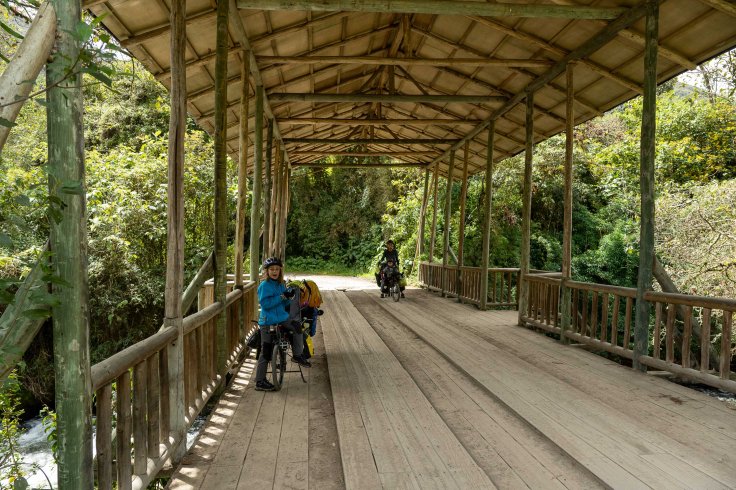 Petit chemin signifie ici retour des pavĂ©s!!! L’horreur! Tout est secouĂ© sacoches, fessiers, gourdes (qu’il faut revĂ©rifier sinon elles se carapatent), enfants!!! Une petite descente nous amĂšne au-dessus du Rio Matadero sur un magnifique pont/ appentis en bois. Le soleil sort et la vue est superbe! 2km encore avant l’entrĂ©e du parc que nous ferons en poussant nos chers vĂ©los, car franchement ce ne sont plus des pavĂ©s mais des cailloux dans lesquelles se coincent parfois nos roues… plus le dĂ©nivelĂ© (140m+) nous n’avançons plus. Pas grave. On pousse! On commence Ă avoir faim alors on est motivĂ© pour arriver le plus vite possible!