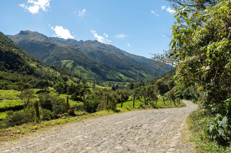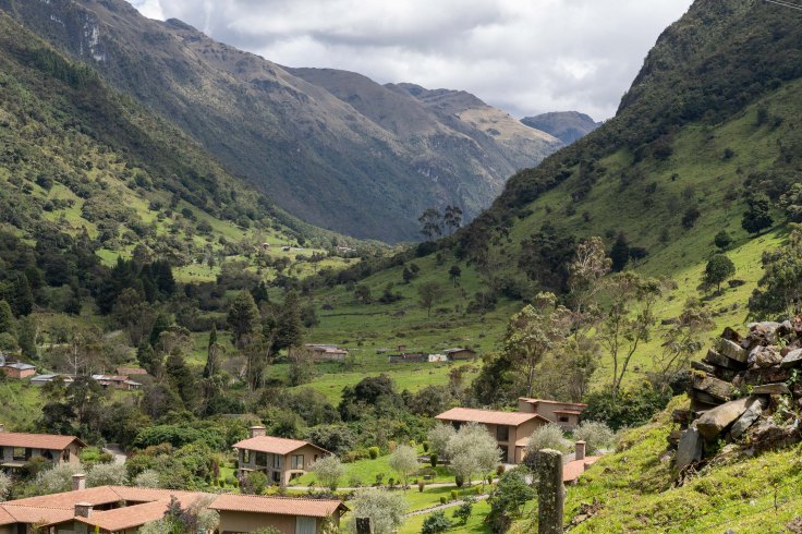 Sur notre GPS, une route parallĂšle Ă la nationale peut nous faire passer par un sentier (en pavĂ©s) jusqu’Ă un village fantĂŽme! On s’y glisse, aussi pour Ă©viter la route, les voitures et les camions. Le dĂ©but de cette route secondaire passe par une Hosteria (hĂŽtel), un restaurant et une chocolaterie devant laquelle Ă©normĂ©ment de monde attend. Le parking, juste aprĂšs est blindĂ©. Cela nous surprend le monde potentiel au vu des voitures garĂ©es et la petite Ă©choppe gustative. Attendent-ils autre chose??? Oui, mais quoi???? Nous traversons le tout et prenons le chemin de cailloux Ă sa sortie parmi la verdure. En sens inverse, un homme (local) Ă pied mais tenant les chevaux avec des touristes, nous interdit d’aller plus loin. On ne comprend pas. Il continue : »Sinon faut payer! ». Alors lĂ , incomprĂ©hension de notre part. C’est un chemin public. Il n’y a pas de raison d’y avoir un pĂ©age. Il s’Ă©nerve un peu et continue de marcher. Nous continuons nous aussi d’avancer plus en avant du sentier. On se fait la remarque qu’il n’y a pas de voitures ou de motos qui passent ici. C’est tranquille et cela nous plaĂźt.