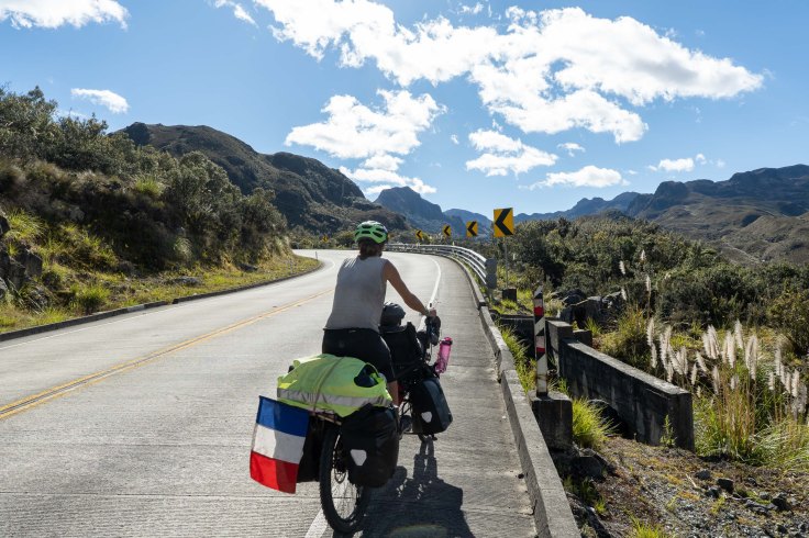 Petit tour dans Cuenca pour acheter une boule de pain (une tuerie! La boule y est passĂ©e hier au dĂźner! On s’en souviendra longtemps de cette mie si onctueuse)… mais les Cuencanos ne sont pas trĂšs matinaux! Tant pis pour nous. Alors direction l’Ouest maintenant. Nous suivons le Rio Tomebamba par les pistes cyclables. C’est trĂšs agrĂ©able de passer la ville comme ça, sauf que la piste est Ă contre sens sur la fil de gauche des voitures et qu’Ă chaque carrefour ou rond point, on doit descendre des vĂ©los pour traverser sur la voie des voitures Ă droite… La sortie de la ville se fait Ă cĂŽtĂ© de la piste du tramway jusqu’au « pĂ©riphĂ©rique » que nous traversons. Une piste cyclable nous est encore dĂ©diĂ© mais sur le trottoir. Le seul hic? A chaque rue, nous devons descendre du trottoir comme des piĂ©tons avec une sacrĂ©e marche aussi! Aie pour les vĂ©los. Quel choc Ă chaque descente et montĂ©e…. alors on finit sur la route. Au moins les voitures qui tournent nous voient et nous Ă©pargnons nos fessiers! Les pavĂ©s disparaissent, les immeubles sont remplacĂ©s par les maisons, et les magasins sont plus rares. Heureusement, nous captons une boulangerie juste avant la sortie urbaine et le dĂ©nivelĂ©.
