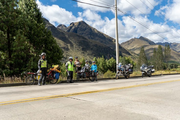 On passe un contrĂŽle policier et entrons sur les terres du Parc de Cajas. Une cascade sur notre droite, une lagune ensuite… puis d’autres viendront nous faire le plaisir de se laisser admirer sur le bord de la route. Deux motards Ă©quatoriens s’arrĂȘtent Ă notre hauteur (lorsqu’on est Ă l’arrĂȘt) pour savoir si nous allons bien et nous entamons la discussion. L’un d’eux a fait Ă moto, Quito/UshuaĂŻa et Quito/Alaska. Alors, bien sĂ»r, on partage nos expĂ©riences mĂȘme si nous n’avons pas les mĂȘmes montures!