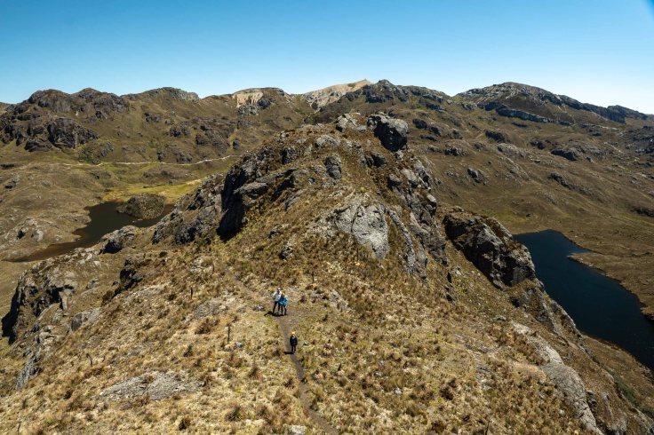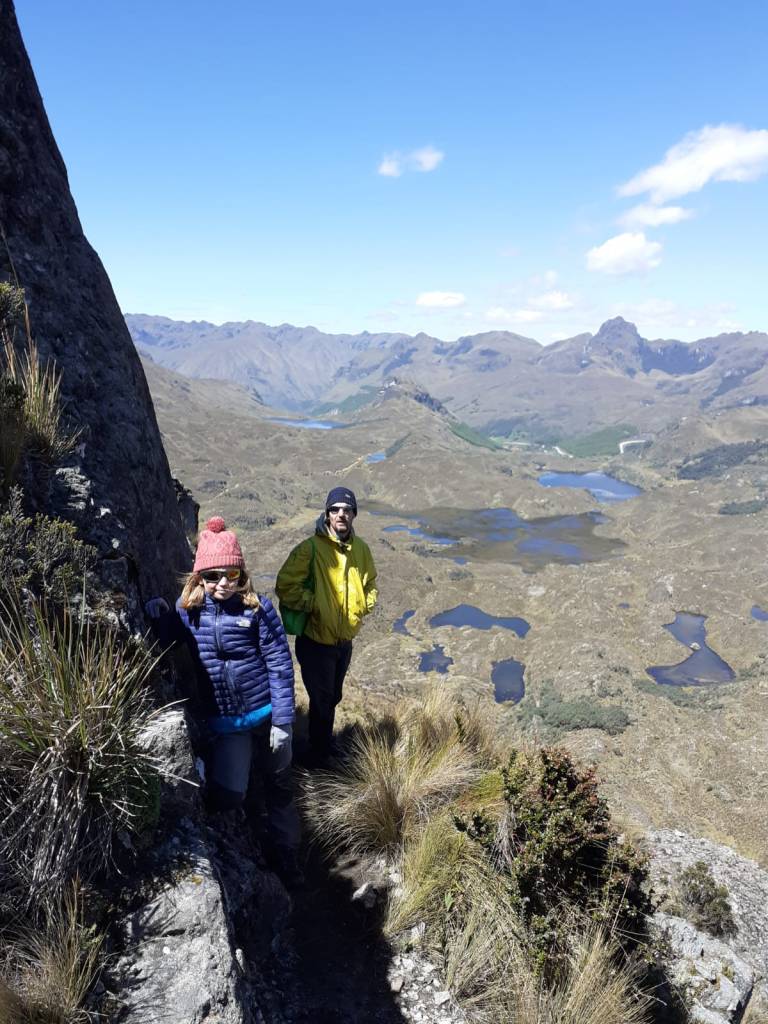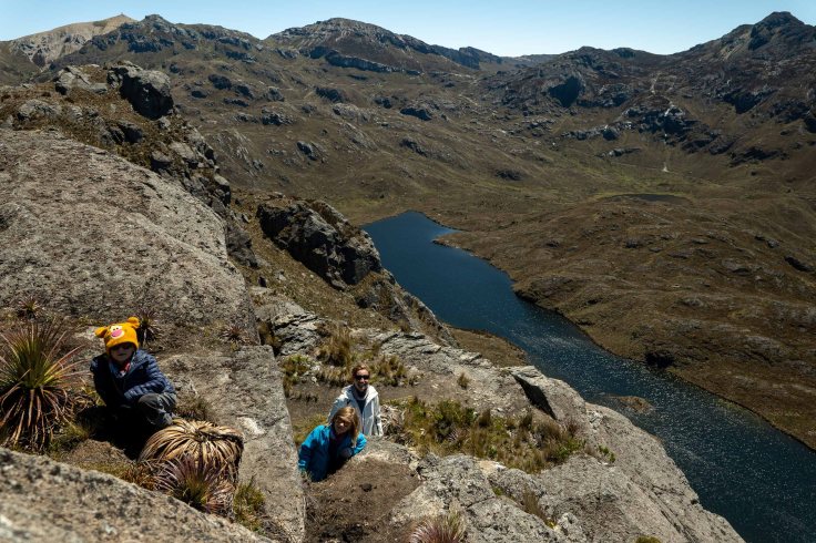 Mais il faut penser Ă la redescente! Cette fois, RaphaĂ«l est avec moi, et Emma avec Sylvain. Quelques blocs de pierres Ă descendre sur les fesses, quelques passages de dĂ©sescalade, mais rien de bien mĂ©chant. Les enfants se sentent bien. Alors on continue par ici. On est prudent, je tiens la main de RaphaĂ«l pour l’aider. Il est en forme et parle beaucoup!! Un vrai mental d’acier. Il nous l’avait prouvĂ© lors de l’ascension de l’Acatenango, cela se confirme encore aujourd’hui. Il a une force physique et mentale impressionnante. Emma profite de l’instant et contemple tout en commençant Ă fatiguer. Elle descend seule sans aide, sauf quelques passages plus glissants. Le vent est toujours prĂ©sent comme le soleil. Attention aux maux de tĂȘte! Le sentier est bien marquĂ© mais il est parfois glissant, mouillĂ©, rocailleux et donc casse-gueule, Ă©troit, vertigineux, Ă l’ombre (et lĂ on sent le climat montagnard!), au soleil et au vent, mais avec une terrible vue sur les Cajas. On ne cesse de s’arrĂȘter pour contempler, enregistrer dans nos mĂ©moires ces paysages.
