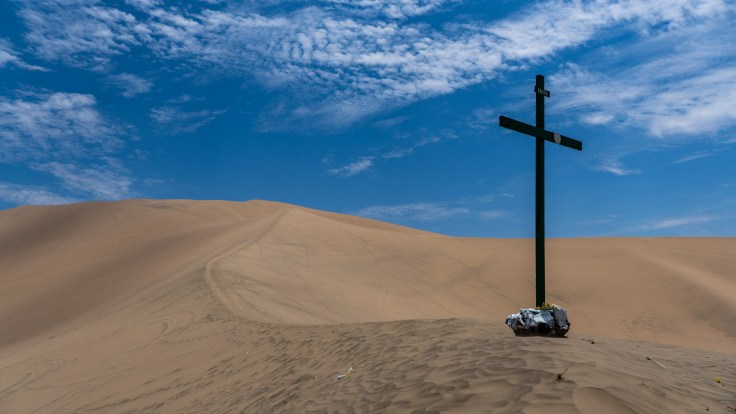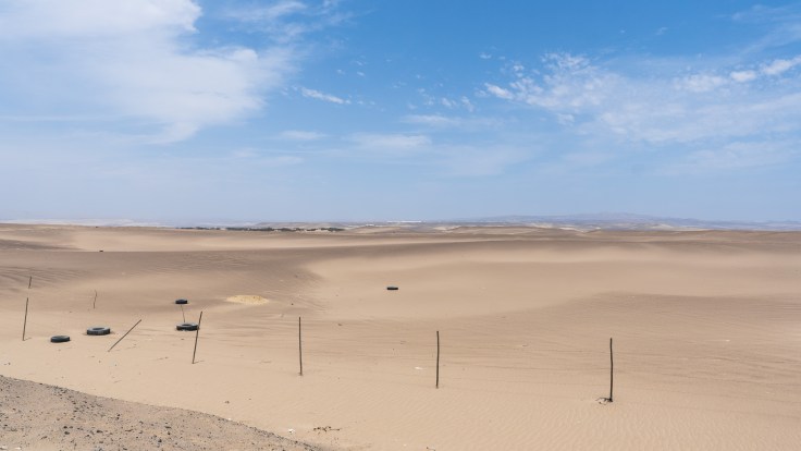 La route est à nous 4 maintenant, avec l’objectif de Nazca, dans le désert pour dans une semaine. La sortie de la ville bouillonnante, la 2×2 voies célèbre retrouvée et nous voilà de retour dans notre univers quotidien sur nos bulles respectives. Le paysage péruvien n’a pas trop changé depuis, le vent est quelque peu présent, le soleil surtout, et le sable!!!