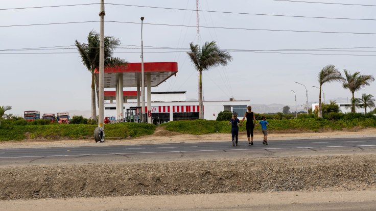 L’arrivée sur Ica a été comme à chaque entrée d’une ville de + de 200 000 habitants: harassante. Bruit traffic (mais là on progresse carrément et on passe! On lève les bras pour arrêter les mototaxis sur les carrefours! On se croit chez nous quoi). Passage au magasin du coin pour les victuailles entre nanas pendant que les garçons profitent de l’ombre près de la sortie de secours. Alors, comme une journée à Ikea : tu rentres avec une idée bien précise de ce que tu veux. Tu ressors avec le double d’affaires, et 3 poches entières, aujourd’hui pour nous de nourriture. Et en plus, Emma, déçue pensait que l’on mangerait tout ça sur le parking dès maintenant!