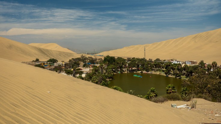 Dommage. Encore 6km à pédaler pour sortir de la ville et trouver l’oasis de Huacachina parmi les dunes de sable.