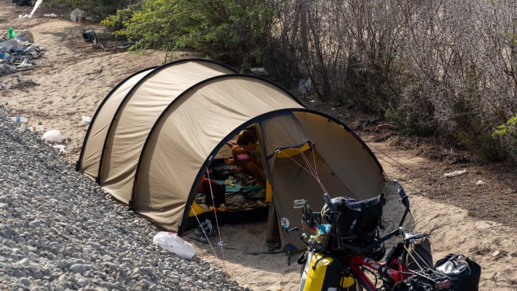 Alors… on descend les sacoches puis les vélos et on déblaye le sable des grands piques de 15cm que Sylvain se prend même dans un doigt ! Vla l’écharde!!! On déblaye encore et encore. Sylvain applanit aussi pour y mettre la tente que l’on monte à la suite, assis par terre pour ne pas attirer les regards.
