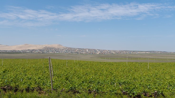 On continue… Le sable et le désert (propriétés privées), puis les vignes qui bloquent nos bivouacs. De véritables usines à vins!! Sur des kilomètres, les vignes poussent en hauteur, à 2m du sol, derrière de hauts murs, avec des filets sur les côtés et dessus. Tout est barricadé, avec des fils barbelés par-dessus les murs. Pas moyen de demander à quelqu’un si l’on peut y planter la tente. De véritables sentinelles.