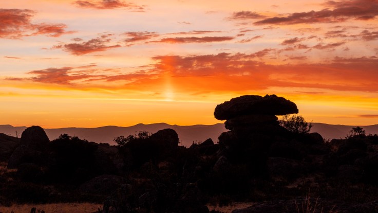 A 12h30 après quelques lacets, 6km, un petit espace sur la droite nous rappelle la Nouvelle Zélande, ses champs jaunies, et ses grands blocs de géant qui donnent envie de grimper dessus, disséminés partout autour de nous. Pas d’habitations, le silence se fait, juste les vaches broutant sur le rebord de la route. Nickel pour le déjeuner au soleil sur un de ces blocs mais qui se termine avec quelques gouttes de pluie, 2 vaches curieuses, gourmandes et très proches, mais heureusement qui ne peuvent pas monter sur la pierre où nous sommes,  puis tout le troupeau. Sylvain fait un petit tour et revient avec une question: et si on restait pour le bivouac? Oh la bonne idée!!!
