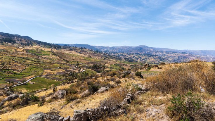 Et au premier virage, surprise: Puquio, la ville est toujours visible! Nooooon, après plus d’une journée, la vallée n’est toujours pas très loin. Au lieu de nous décourager, ça nous fait rire! Parce que l’on était vraiment fier de nous et que finalement, on a l’impression de ne pas avoir quitté Puquio ! On pédale encore une heure, ça y est, on est sur le plateau, de l’autre côté de la montagne, et la vue est grandiose 11km après notre départ. Toujours des montagnes à perte de vue. Des champs, des vallons, des rivières asséchées, des buissons, des fleurs fleuries, des couleurs qui tranchent avec le ciel, des murets tout autour des parcelles, et même des grottes!! On se sent bien dans ces endroits si reculés. Sans habitation encore aujourd’hui.