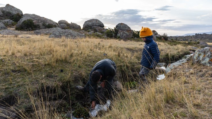 Raphaël lui en profite pour dessiner dans l’abside à l’abri du vent et du froid, malgré le soleil bien présent maintenant. L’école fera son apparition pendant que Sylvain après 3 essais dans les environs, trouve une source d’eau à 20 min de là, perdu entre les lapins des Andes ou viscaches et un hibou qui veille à ce petit coin isolé. L’appareil photo et la pochette de 10 litres sontvenus avec nous lors d’une dernière promenade, avec ce coucher de soleil majestueux entre les blocs et tous ces animaux autour de nous, pendant que Sylvain avec la casserole, récupère le précieux liquide.