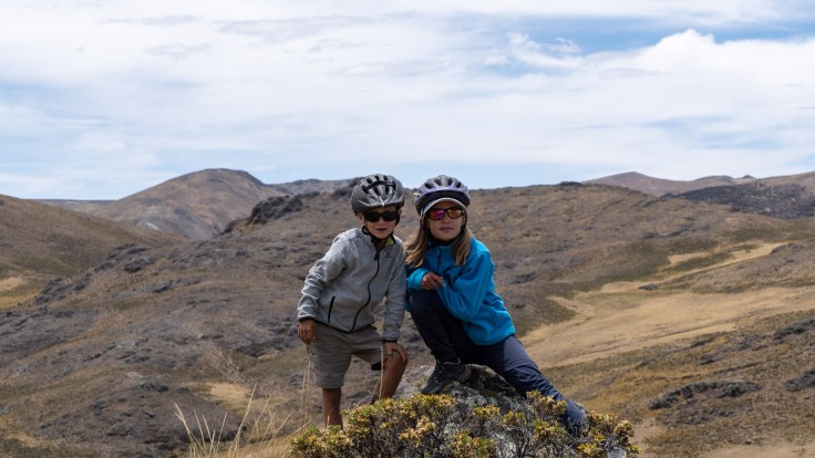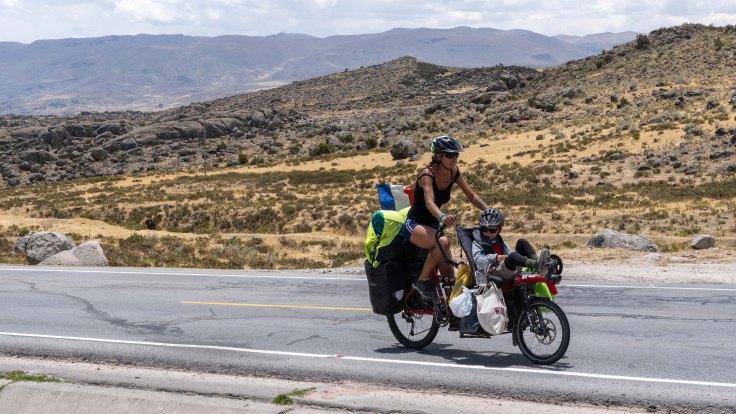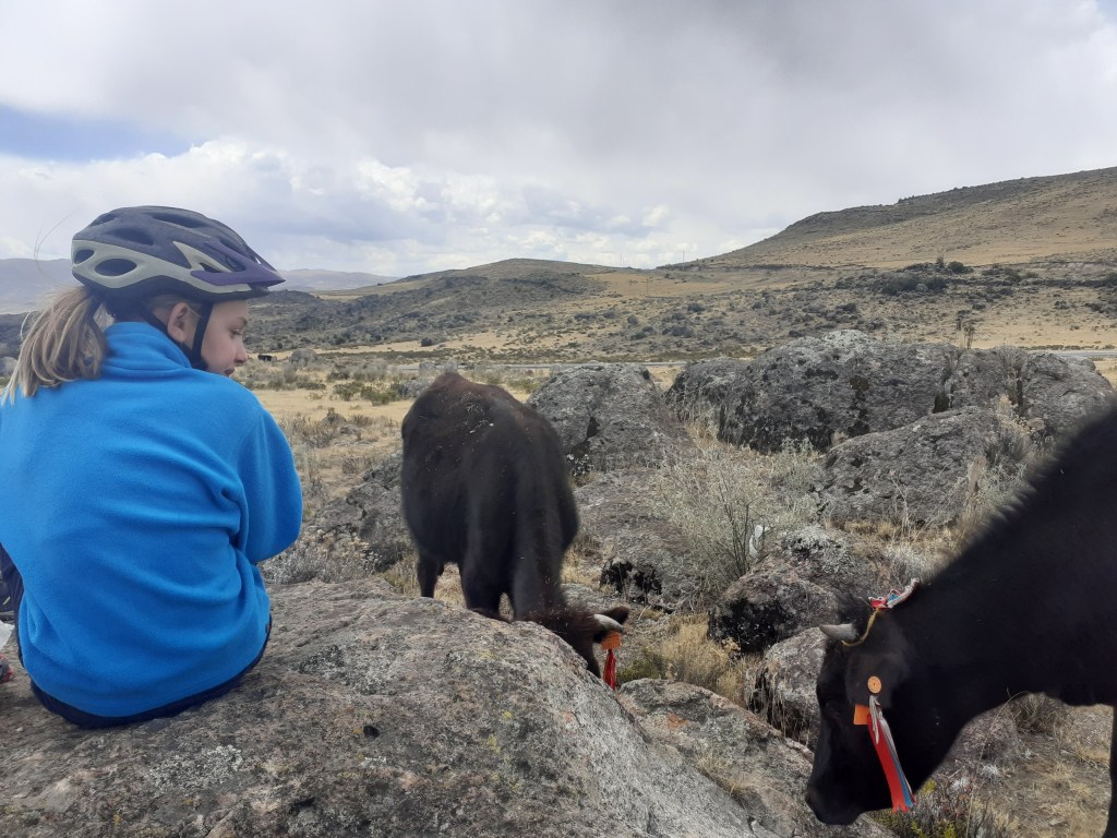 8h50 et c’est le décollage non vers l’espace mais presque : vers le ciel et les 4000m. Le jaune des herbes complète bien le bleu pur du ciel. Les roches des montagnes sont plus sombres et amènent une touche de profondeur au tableau devant nos yeux. Nous montons vers le plateau encore et encore, par lacets mais sans une pente trop difficile. On pédale bien quoi. Même un condor nous encourage et passe au-dessus de nous. Son ombre immense nous stoppe, les yeux vers le ciel… Trop tard pour la photo, il est déjà parti. Au bout d’une heure, c’est la première halte et le bilan: 5km de fait. Ce n’est pas si mal car on a dépassé la barre des 4000m d’altitude. Une bonne boisson avalée, quelques caramels au cœur chocolat blanc sacrifiés par mes 3 gourmands, un beau panorama apprécié avec les plateaux visibles de l’autre côté de la vallée. Le soleil cogne bien, l’air est frais mais sec. La pause est terminée et l’on se sent fatigués. Enfin que les adultes! Les enfants nous épatent car ils pètent la forme… hors vélo! 🤣 Des fois, on oublie avec Sylvain que l’on est aussi haut. Mais il faut qu’on le prenne en compte, pour notre souffle, l’effort, les jambes…