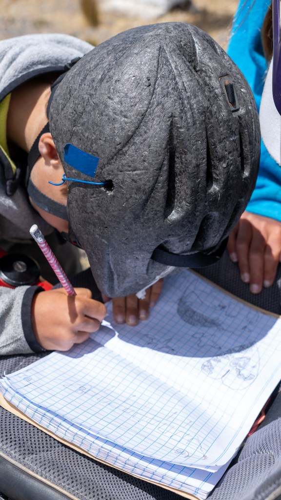 Le retour à la tente se fait avant la nuit, juste avant la préparation du repas, l’écriture de la journée adossée dehors face au panorama. La fin de journée est vite arrivée après un câlin pour réconforter les enfants fatigués et grognons tous les 2. Le repas du soir avec doudounes et bonnets entendra les rires des enfants avant la mise au lit avec t-shirt manche longue et « Raiponce » en dessin animé pour remonter le moral des loulous.