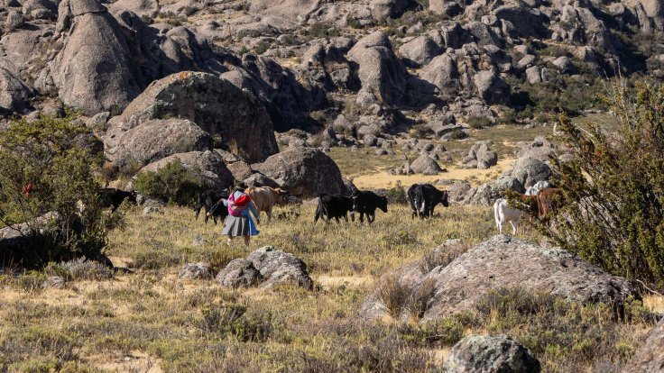 Alors on s’arrête, on boit notre eau, on admire, on photographie, on se questionne sur cette ville qui nous paraît toujours là, on sourit de ce panorama et cette chance d’être là. Première grande pause à la diffurcation de Quisuarniyog, pour des bananes, des caramels fourrés au chocolat blanc, et les petits biscuits offerts de ce matin qui n’ont pas survécu à cette pause! 😅 11km de réalisé. Ce n’est pas si mal à 11h devant des montagnes à perte de vue, des près cultivés, des troupeaux, des sources d’eau qui s’exaltent de sortir de terre, le ciel bleu et ses quelques nuages qui arrivent de la cordillère. La végétation réapparaît, les arbres polylépus, les buissons, les lavandes fleuries et les bonnes odeurs.