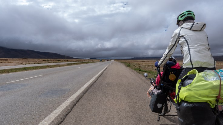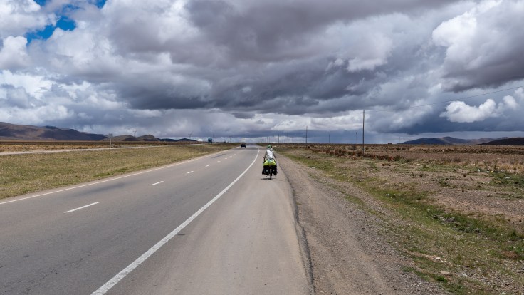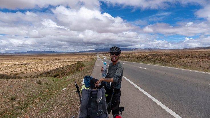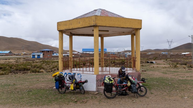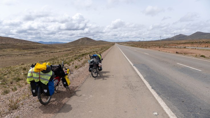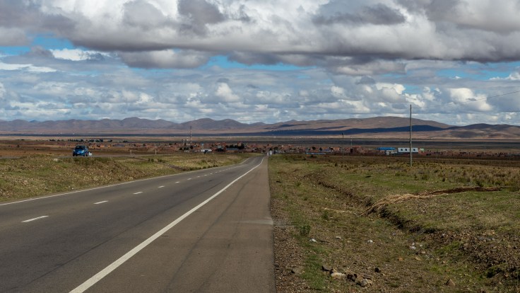 Puis l’après-midi s’entame avec les sourires, le ventre plein, le moral aussi, le soleil et le ciel bleu entre les nuages blancs, le paysage naturel et désert autour de nous, la route sur asphalte en 2×2 voies, avec parfois les klaxons…. et elle passe très vite! On cherche déjà un site pour camper après le village de Sica Sica, avant que la pluie n’arrive. La prudence est de mise… Déjà 62km dans les jambes, mais toujours pas possible de bivouaquer autour, les terrains sont cultivés, plats et sans protection contre le vent ou la vue des automobilistes de la route. Alors, on continue jusqu’au village de Villa Esteban Arce, pensant s’y cacher parmi les constructions non terminées. Mais que nenni.