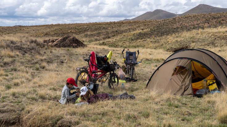 Il est 15h lorsque nous débarrassons nos vélos de toutes leurs sacoches et que la tente s’élève. Les enfants sauvent un insecte dans la mare et arrivent à y voir 2 batraciens. Le reste de l’après-midi ? Il faut demander à Sylvain. Une fois la tente montée, les matelas mis dedans, je me suis endormie pendant qu’il partait photographier les alentours. 1h de sieste pour moi (il viendra aussi ensuite dormir un peu) pendant que les enfants jouent dehors sur l’herbe avec casquette car ça cogne. Ah oui, j’avais oublié de dire qu’avant Calamarca, la pluie avait cessé et le temps s’était réchauffé comme nous. On profite alors mieux du paysage dégagé. Après ma sieste, je suis restée au lit à comater, au chaud sous la couverture, à avoir froid parfois, à ne pas pouvoir me lever et à me rendormir… pendant 2h de plus. Un coup de mou aujourd’hui pour moi. Quand enfin, je sors de là, il est plus de 18h30. Les enfants se sont amusés tout ce temps, Sylvain a filtré l’eau de pluie que l’on nous avait offert, a fait un petit tour et a commencé à préparer le repas. Nous prendrons notre repas dans l’abside car dehors il fait déjà nuit et frais avec le vent.