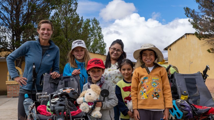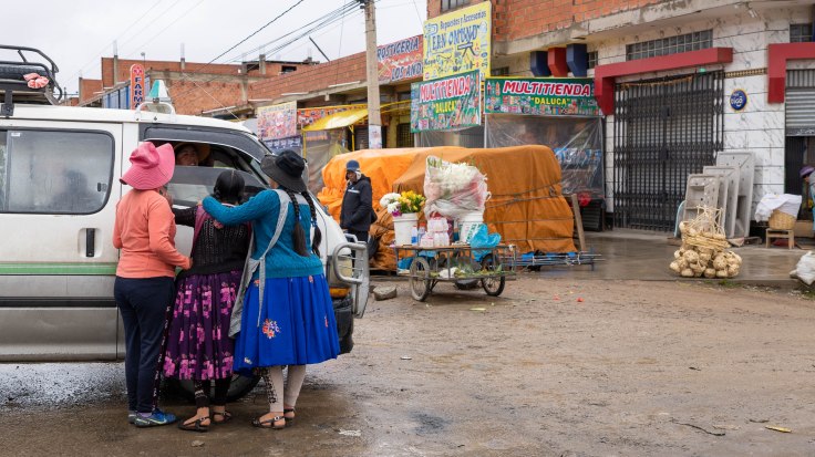 Et cette route, elle sera bien agréable pour nous 4 aujourd’hui, pour la météo bien clémente par rapport à la veille, et l’accueil de la population! On aura même l’impression qu’elle passe très vite, tellement nous avançons bien, la route légèrement en pente en notre faveur. L’esprit est ailleurs que dans l’effort grâce au paysage autour de nous. Les 39 premiers kilomètres nous font traverser des petits villages comme Tolar et Mantecani, avec la playlist de Noël dans les oreilles et en chant! L’espace sur le côté, juste pour nous, et les quelques motos qui nous doublent, est sécurisant. Alors, on continue ainsi à pédaler ensemble, jusqu’au repas que nous prendrons à Patacamaya. La ville nous plaît dès le premier rond-point, avec ces miches de pains croustillants, dorés, et que l’on dévalise! Quelques mètres plus loin, et on se perd dans un petit supermercado! Oui, oui, on ne pense qu’à manger (les cyclos nous comprennent!) et on profite du banc, au soleil et au vent devant la tienda, pour engloutir notre déjeuner. Un homme s’arrête à notre niveau pour discuter, il nous a vus hier au départ de la capitale! Excellent! On aime ces petits moments d’échange qui nous réchauffent.