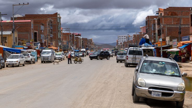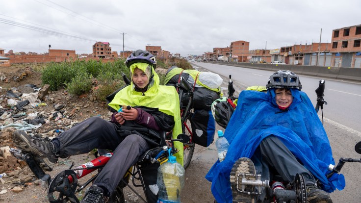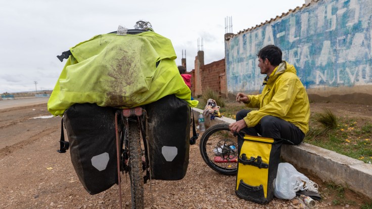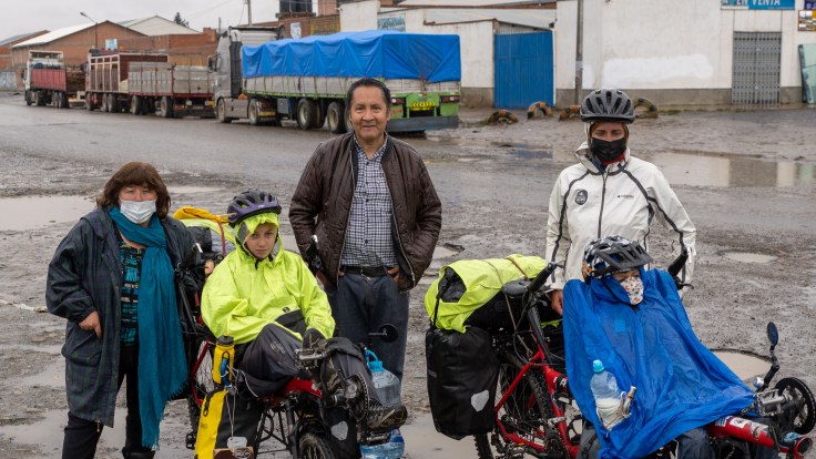 Nous revoilà à 4, à 7h30, sous la pluie gelée, parmi le trafic abondant même un dimanche, les travaux qui nous obligent à passer sur des tas de terre, à éviter les bains de flaque d’eau (de boue plutôt) où Sylvain y plonge tout de même une chaussure, à éviter les minibus qui freinent sur le côté juste devant nous, à jouer à « Sonic » en slalomant entre les trous sur la chaussée qui est remplie d’eau et de boue venant des « trottoirs » des bas-côté. Oh que la journée va être dure. Moi, j’ai déjà très froid. L’eau s’est insinuée dans les chaussures, le corsaire et jusqu’aux sous-vêtements, et elle est gelée. Heureusement, nous avons un objectif: atteindre Oruro dans 3 ou 4 jours à 220km. Ce sera notre porte pour les salars du Sud du pays.