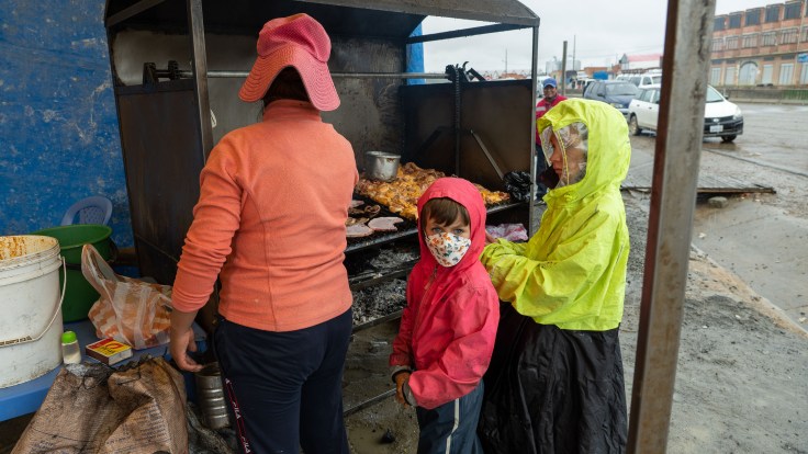 Alors, nous avançons parmi la cacophonie ambiante des véhicules sur cette 2×2 voies, aux feux tricolores peu respectés, pour quitter la ville. Les mains ne se sentent plus sous ce froid humide. Je les réchauffe l’une après l’autre sur ma cuisse pour quelques instants. Ça marche quelques minutes. Le tour de cou monté jusqu’au nez, les chaussettes remontées elle aussi… mais recouvertes de boue grâce à nos roues, pendant 1h30 ce sera notre aventure. Puis enfin, pour se poser, nous trouvons un restaurant qui fait des almuerzos à 9h du matin avec soupe, côte de porc et riz! Nous sommes gelés. Les pantalons d’Emma sont trempés, Raphaël ça va, il chantait sur le vélo et Sylvain a froid aux mains. J’ai les lèvres bleues. Je frissonne tellement que j’en fais tomber les nouilles ou la cuillère de soupe. Je refuse de mettre ma doudoune dessous de peur de la tremper également. J’en aurai peut-être besoin ce soir pour me réchauffer et remplacer ma polaire sur moi actuellement. Un mal de ventre se profile aussi… Ce n’est pas la grande forme mais ce n’est pas souvent! En attendant, le repas est chaud et les enfants peuvent même se réchauffer près du barbecue, on se pose vraiment le temps que la pluie s’arrête. Pas de toilettes au restaurant, les toilettes publiques étant fermées, c’est une recherche dans les gravats, les travaux et les maisons abandonnées en terre rouge avant la fin de la zone urbaine.