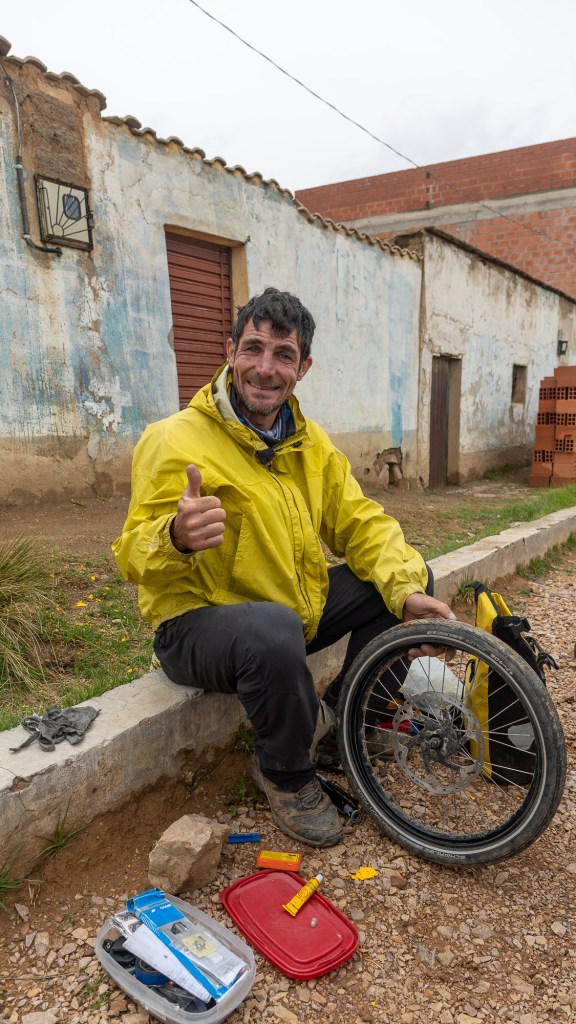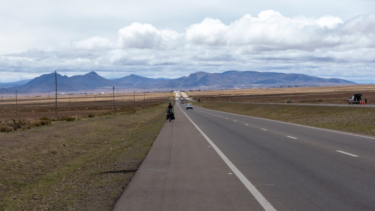 Ensuite, c’est une belle ligne droite sur ce plateau, où nous traversons des villes, plutôt des villages, non vraiment des lieux-dits. Pas d’arrêts pour l’instant, on se concentre sur la route, qui s’est élargie avec un shoulder sur notre côté, moins de circulation, moins de maisons, plus de champs, plus de bétails et une route qui monte et descend. Nous avions bon espoir pour une amélioration de la météo avec ces nuages plus hauts en altitude que nous voyions à l’horizon, et qui paraissaient dégager une vue sur le soleil. Il n’en sera rien. La pluie a bel et bien repris avec le même degré de température. Pas de musique avec le téléphone mais j’ai mon Raphaël qui me chante « We Will Rock You » de Queen… enfin juste cette phrase en boucle! Ça me fait sourire et me permet de réfléchir à autre chose qu’à la dureté du moment. Et puis on avance tout de même malgré la fatigue qui arrive et me fait fermer les yeux. Un petit péage et la route nationale 1 est à nous. Sans trop de circulation, nous arrivons même à entendre quelques klaxons d’encouragements ou de mains levées. Des éleveurs/éleveuses assis dans l’herbe près de leurs bêtes nous sourient et saluent. Ce changement d’ambiance est agréable et nous amène jusqu’à Calamarca où le pneu avant de Couillot crève. C’est l’occasion d’acheter dans les 2 tiendas du village (le plus grand de la journée que nous traverserons) quelques chips et galletas pour compléter notre pique-nique au pied de la statue des mineurs. Une rustine de mise, un pique en métal enlevé du pneu, et nous quittons à 13h30 le trottoir où nous nous étions assis pour manger face aux cochons!