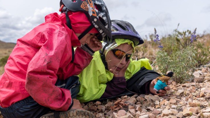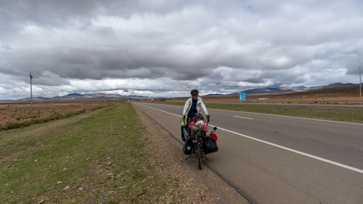 Seulement les gouttes arrivent, poussées par le vent, les nuages et le ciel bas nous menacent et nous obligent à délaisser notre dessert et à le remettre à plus tard (beaucoup plus tard!). Poncho, pantalons de pluie, poche plastique pour les pieds des loulous évitant de leur tremper leur seule paire de chaussures (avec les tongs, d’aucune utilité ici vu les températures frigorifiques!) et veste de pluie pour les adultes. L’attirail n’aura servi que quelques minutes et les peluches mises à l’abri le temps de passer cette fraicheur jusqu’à une petite remontée. Ensuite, c’est le retour du soleil et des montagnes russes boliviennes. Chaque descente est suivie d’une côte qui est suivie d’une descente. Effet coupe jambe garanti parmi le même paysage grandiose, avec ces rares maisons au loin qui scintillent et ces vendeuses dans leur petite cabane de pierres.