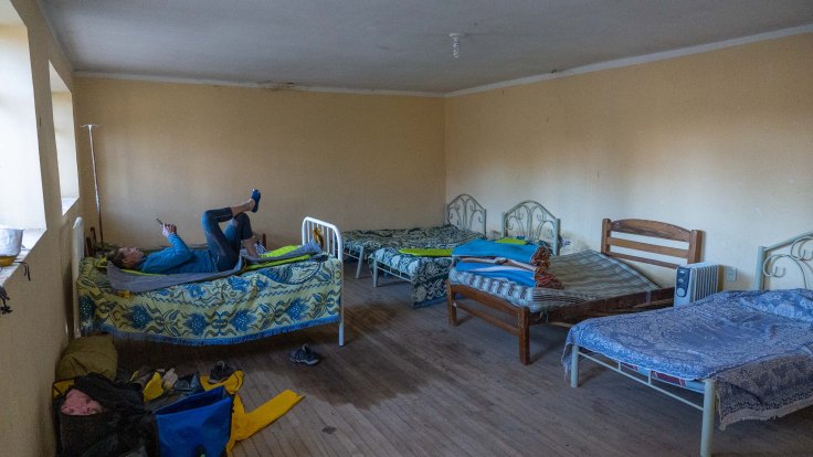 6km plus loin, rebelote: mon pneu avant se dégonfle de nouveau! Argh. Arrêt forcé face à une petite usine, fermée aujourd’hui. Pendant que Sylvain répare une nouvelle fois cette chambre à air déjà bien rustinée, je vais toquer à la porte de la fabrique de lait pour quémander 10 litres d’eau. Si on peut en trouver, on pourrait camper dans le coin et souffler… sinon le prochain village pour en acheter serait à 7km. Et bingo! Un homme m’ouvre et accepte de remplir par de l’eau de pluie, la poche! Yes! Et en plus, les terrains autour sont publics et nous pouvons y poser la tente. On peut chercher à côté des vélos sur la route, parmi les champs, un coin plat pour nous… Et à côté d’une petite mare avec sa grenouille, dans le lit asséché d’une rivière, nous trouvons notre bonheur sur un espace sans déchets (ce qui même à 4000m d’altitude dans les rivières venant des montagnes, est loin d’être évident!).