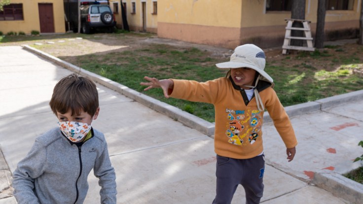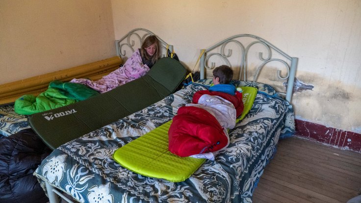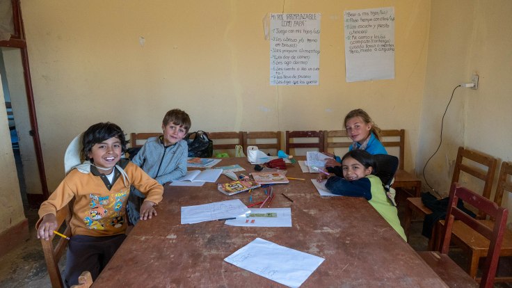 On se replie donc sur le Centre de Salud du village, pour camper à l’extérieur près des murs d’enceinte, pas loin d’un édifice occupé, pour notre sécurité. C’est Eliana qui nous accueille, avec ses enfants, Jolre et Annabella. C’est le médecin du centre avec qui Sylvain fait le tour extérieur… et qui finalement, préfère nous voir dormir dans l’enceinte! Bonne nouvelle pour nous, et encore une fois leur gentillesse sera sans limite. Elle nous propose une pièce, juste pour nous, à l’abri du vent et de la pluie, un ancien dortoir d’hôpital! Il y a même une perfusion près d’un des lits. Une autre pièce nous est réservée, avec une grande table et des chaises! Elle sera prise d’assaut par les 4 enfants, pour dessiner, discuter, après avoir joués ensemble dehors à la cuisine avec des poupées, des fleurs, de l’herbe, des branches d’arbres, tout ce que les filles ont pu trouver. Pendant ce temps, les garçons se transforment en animaux: serpent, dinosaure, tigre… pour se combattre! L’entente est parfaite pour les 2 binômes! Cela fait plaisir à voir autant de sourires et de vie. Eliana aussi est ravie pour ses enfants en vacances scolaires actuellement.