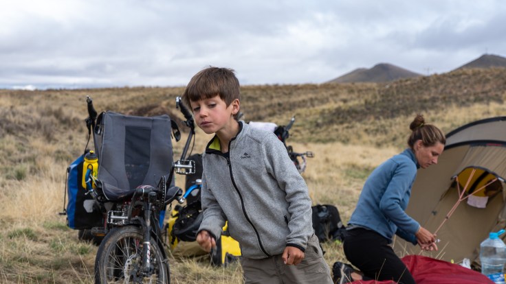 La pluie n’a pas cessé lorsque nous déchargeons tout, par 5°C humide, avec de gros nuages gris bien tassés, bien bas. On met déjà les ponchos et pantalons de pluie pour les loulous, nous, nos vestes de pluie. On sait déjà que l’on sera trempés sur les jambes, les pieds et que les mains seront bien vite gelées avant de rouler. Nous leur disons au revoir et merci pour cette aide précieuse, leur gentillesse sur ces 3 jours, pour leurs dons de repas hier encore, pour les cadeaux aux enfants (un scorpion en origami et une poupée) et hop, une petite photo avec eux !
