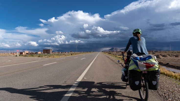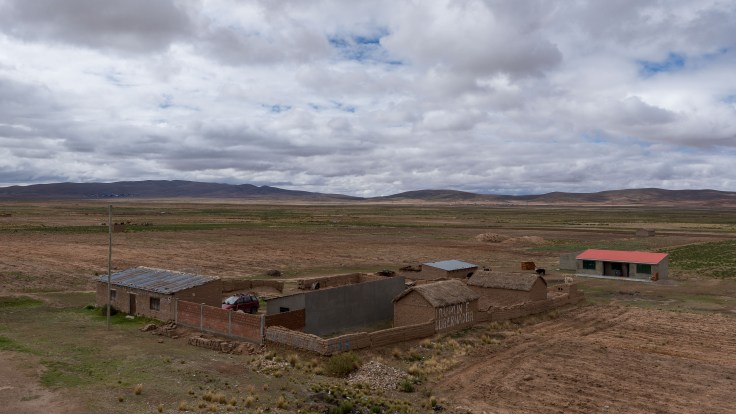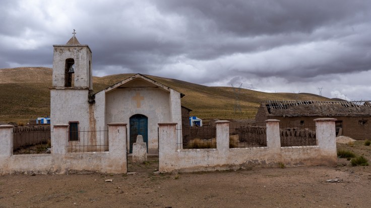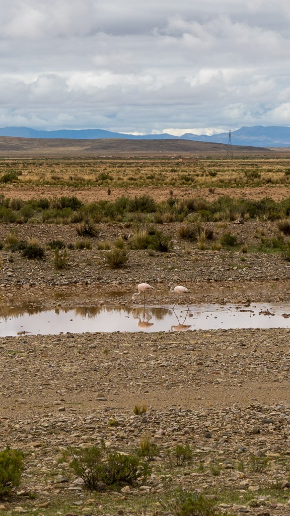 On repart l’œil vers l’Est, fixé aux collines noires et aux rideaux de pluie visibles de nos vélos. On se fixe de trouver un bivouac dans un champ avant la venue de la pluie. Mais rien avant 16km. Alors on profite du paysage, de cette terre rose puis blanche argile, où quelques touffes d’herbe poussent. Le sol est trempé, meuble, et l’inondation assurée dans cette glaise. On trace notre route et demandons à la communauté de Pasto Grande, mais ni la première femme ni la famille ensuite travaillant dans leur champ ne peuvent nous répondre. Les terres appartiennent à la communauté et ils ne peuvent donner leur accord. Ils nous préviennent que personne au-delà ne pourra le donner d’ailleurs. A quoi bon s’enfoncer plus loin, nous faisons demi-tour direction la nationale 1. Il reste 22km avant Oruro, ville de 200 000 habitants. 16h12. Route plate. Nuages noirs à l’horizon. Avec toutes ces informations, c’est à nous de prendre la décision. La meilleure décision pour nous 4. Est-ce qu’on se sent d’y aller, après la journée dans les pattes? S’il le faut, oui! On mettra le cerveau en off, permettant aux jambes d’être libres de pédaler sans discontinuité. Mais que ce fut dur. Dur de garder le rythme surtout, de ne pas ralentir. Alors on change de playlist et c’est la mienne qui ressort, plus soutenue que celle de Noël. Faut être motivés. Si toutefois on a l’opportunité d’être sous la tente ce soir, on ne se ferme pas cette porte. Mais la ville grossit de plus en plus sur la montagne face à nous, secouée d’éclairs… Alors que nous sommes au soleil! Le contraste de teinte et de luminosité est sublime. On avance toujours sur les champs cultivés, puis sur les maisonnettes d’une fenêtre et d’à peine 10m2 qui sont vides sur leur terrain nu. Même notre tente ne tiendrait pas dedans.