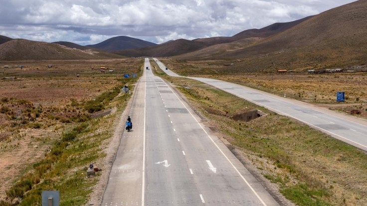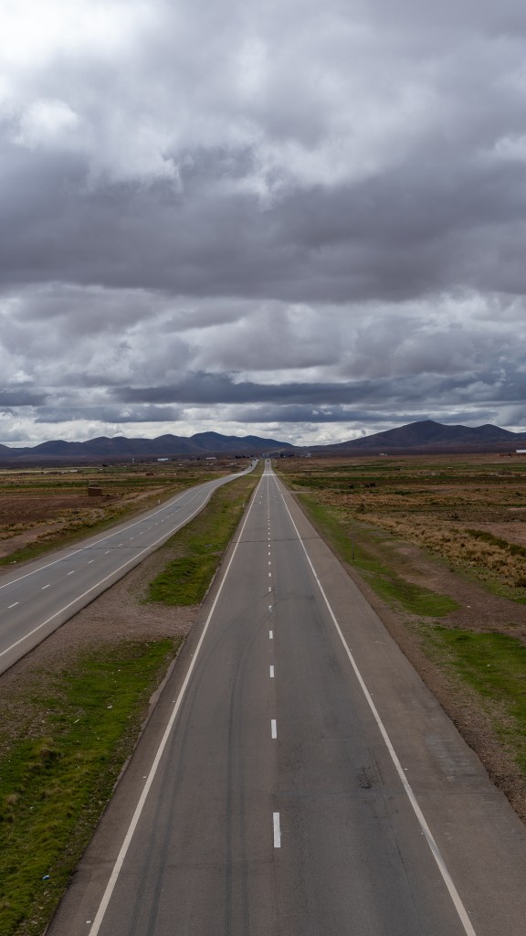 On est toujours sur l’altiplano, entourés de collines vertes et jaunes, avec une route plutôt plane, quelques villages à traverser sur cette 2×2 voies et ces passages piétons aériens, légions mais parfois pas en très bon état. Ils suffisent à Sylvain pour faire des photos, pour les enfants à se retrouver pour jouer avec leurs peluches baptisées « Sarah et Oscar » (marrant, ça me fait penser à 2 dessins animés de mon enfance…), pour moi à dévorer tout ce que je trouve dans la sacoche noire! La route est plaisante et sujette à la méditation, avec cet espace très large pour nous, nous permettant de rouler en sécurité (même si l’œil reste sur le rétro) avec toujours la playlist de Noël dans les oreilles (le mois de décembre me semble long, non?). L’accueil nous plaît aussi, même si les boliviens sont timides dixit Éliana, ils répondent très souvent et on se sent bien grâce à ces retours. Cette belle ligne droite que les boliviens adorent, nous fait entrevoir rapidement un seul virage sur la droite pour nous amener à passer un « col » entre 2 collines. On m’avait prévenu de cette côte de 150m mais aussi de la descente, la longue descente à la suite. Motivant n’est-ce pas? En plus, les nuages blancs font leur danse rapide sur ce ciel bleu, sans pluie! Mr météo de ce matin s’est trompé…. pour l’instant.