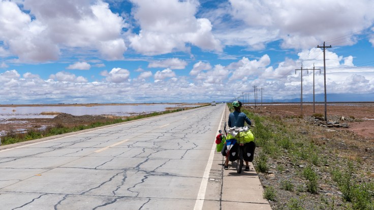 Ce n’est qu’à 11h15 que nous quittons ces jeux pour la route numéro 12 dans ce 12ème pays, en direction du Chili vers l’Ouest. Encore quelques pains achetés pour ce midi avec des œufs, et nous longeons le lac Uru Uru et ses centaines de flamands roses. Les montagnes en fond, l’eau, le reflet du ciel et des nuages dessus, donnent une ambiance magique à ce lieu. Peu de bruit, la ville en arrière plan avec sa statue de la vierge, ces maisons en terre rouge, ces déchets sur le bord, les abords de la route inondée, nous continuons notre route et cherchons un endroit pour déjà s’arrêter pour manger! On en rigole avec Sylvain mais on sent qu’aujourd’hui, on ne va pas aller très loin. Pas grave. C’est ça l’aventure, ne rien planifier, faire avec ce qui se présente et prendre son temps: un luxe. Alors, on continue à pédaler, passons en toute quiétude un barrage militaire (ça fait du bien!!!) et entamons notre ligne droite de 200km. Elle commence très bien pour nous. Imaginez, une route goudronnée surélevée avec de chaque côté de la terre glaise rouge, des flaques, des flamands roses, les abords d’un lac, du ciel bleu et de beaux nuages blancs, des montagnes pour clôturer la vue à l’horizon. Sublime. On est aux anges car le paysage change, et nous plaît beaucoup. Il correspond à l’imaginaire de cette Bolivie tant attendue.