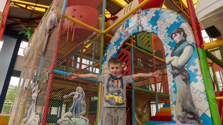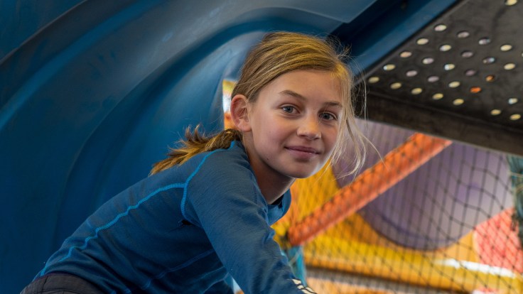 Les quelques personnes qui attendent devant, nous confirment l’ouverture imminente du terrain de jeux 8min plus tard. Ok, on se laisse tenter par les cris de joie des loulous, leurs sauts et leurs yeux émerveillés, accrochés au grillage de la clôture à faire des plans sur l’ordre des jeux qu’ils aimeraient faire. Sympa que nous sommes, nous leur laissons le choix de décider du temps qui leur semblerait approprié pour en profiter. 15min nous répondent-ils. Quoi? Seulement 15min? Nous, nous pensions 1h, histoire qu’ils savourent ce temps hors du temps, hors du vélo, ce temps enfantin rien qu’à eux. Et nous voici donc dans ce parc quasi seuls, à suivre nos enfants, à les entendre rire, à les entendre avoir peur dans le gigantesque toboggan (un truc de fou, vous verrez sur la photo!), à courir, à s’essouffler parmi les boules et les structures, à jouer à cache-cache avec Sylvain… à être heureux d’être des enfants.